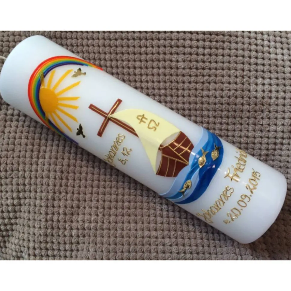Taufkerze Boot – Arche – mit hochwertigen Wachsverzierungen