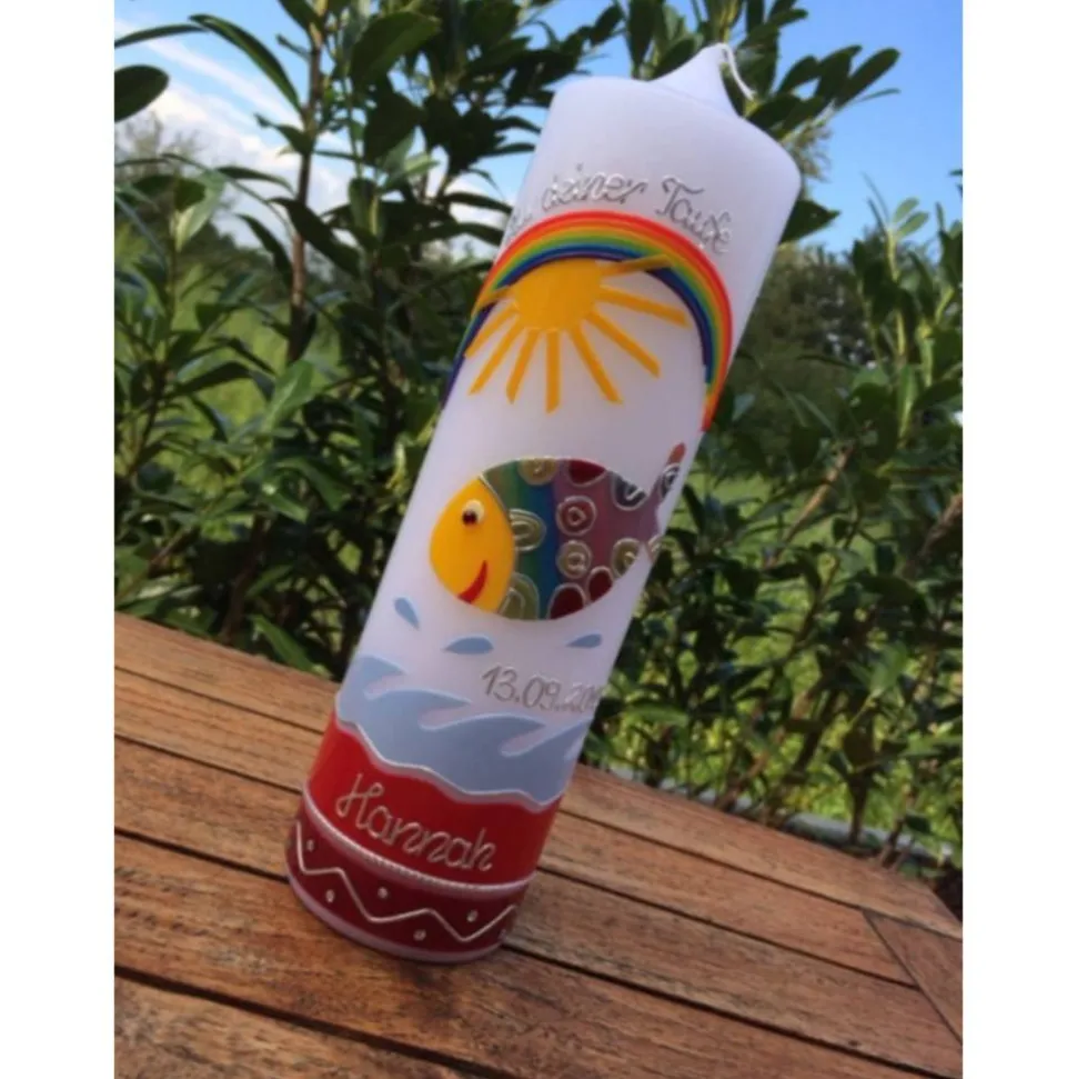 Taufkerze bunter Fisch mit hochwertigen Wachsverzierungen
