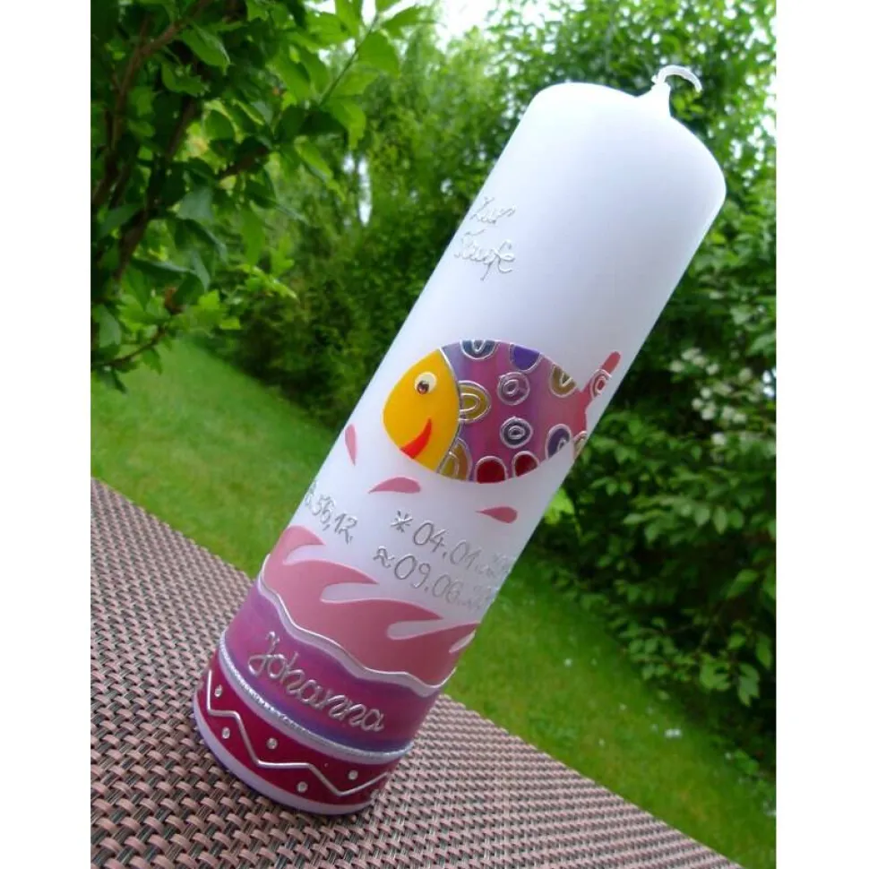 Taufkerze bunter Fisch mit hochwertigen Wachsverzierungen