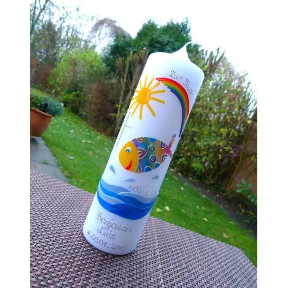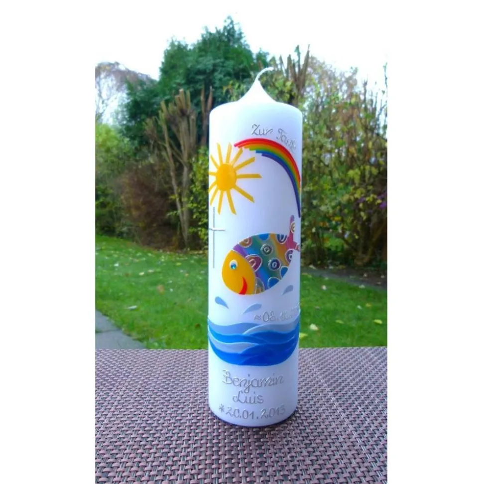 Taufkerze bunter Fisch mit hochwertigen Wachsverzierungen