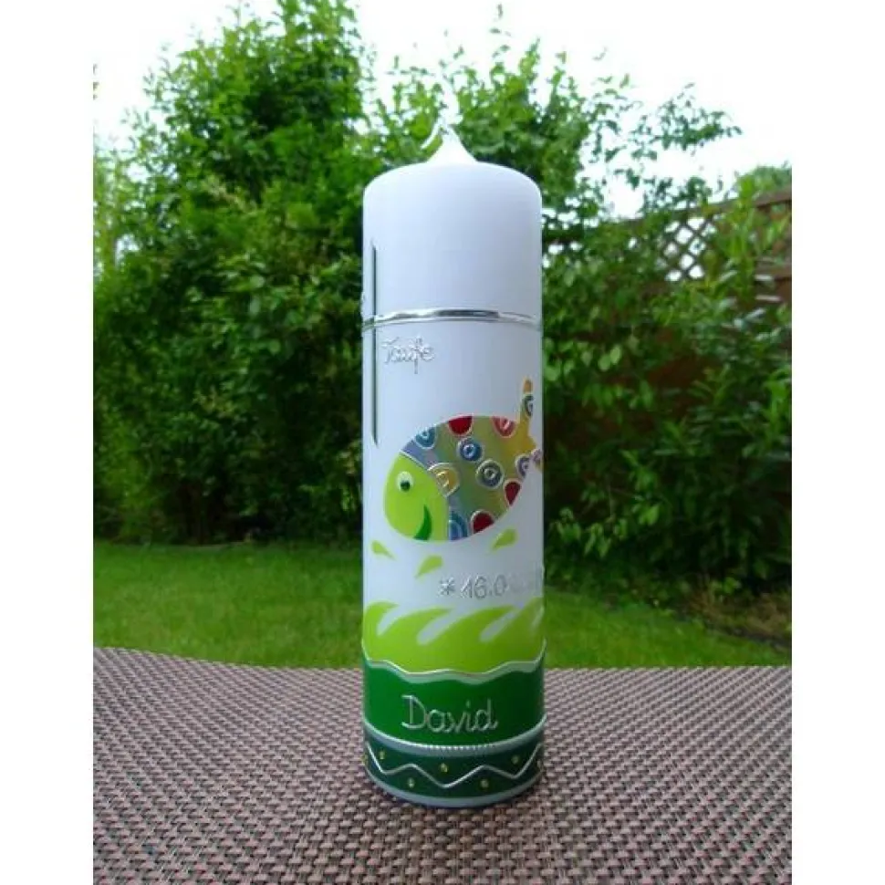 Die Verzierung auf der Kerze wird in liebevoller Handarbeit für Sie erstellt.