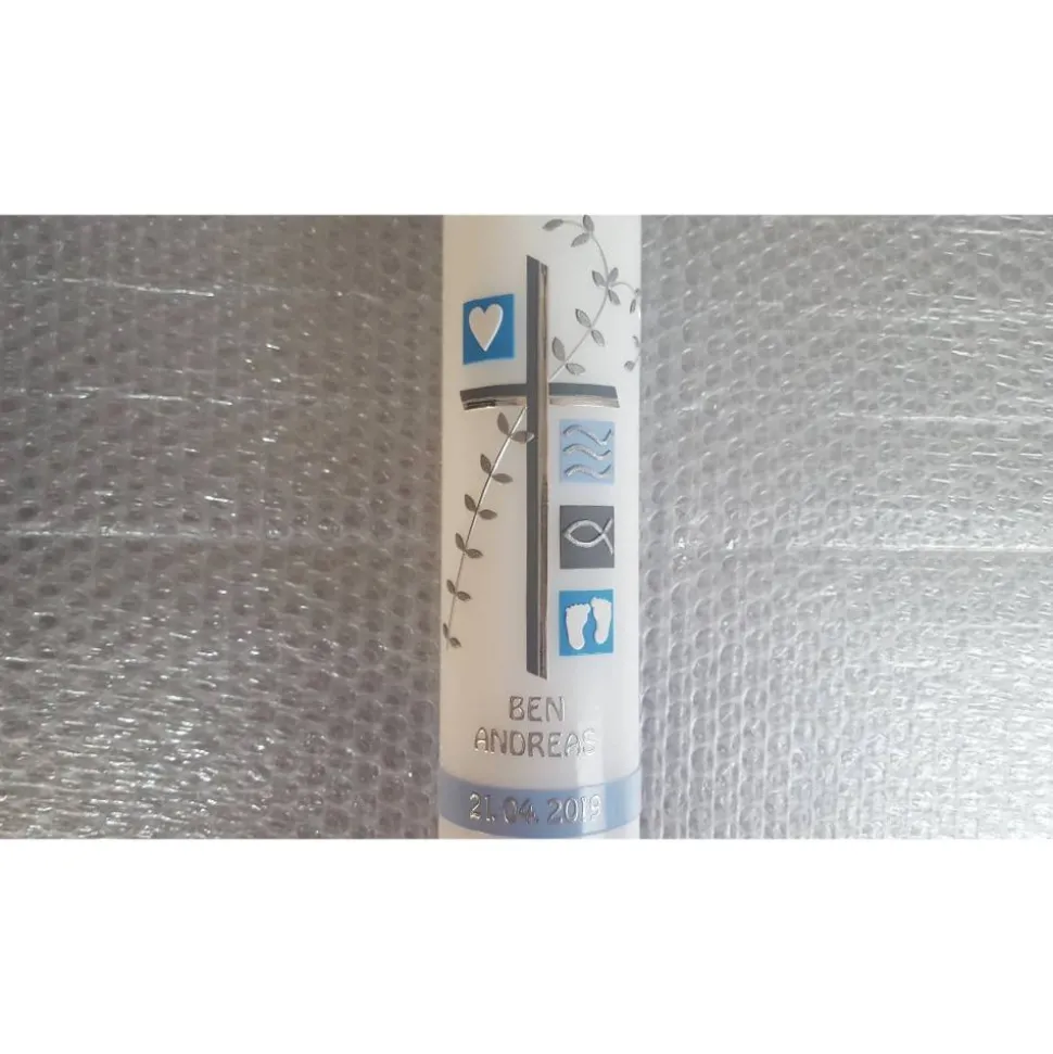 Abgerundet wird das Motiv durch die silberne Blätterranke, welche der Taufkerze einen edlen Touch verleiht.