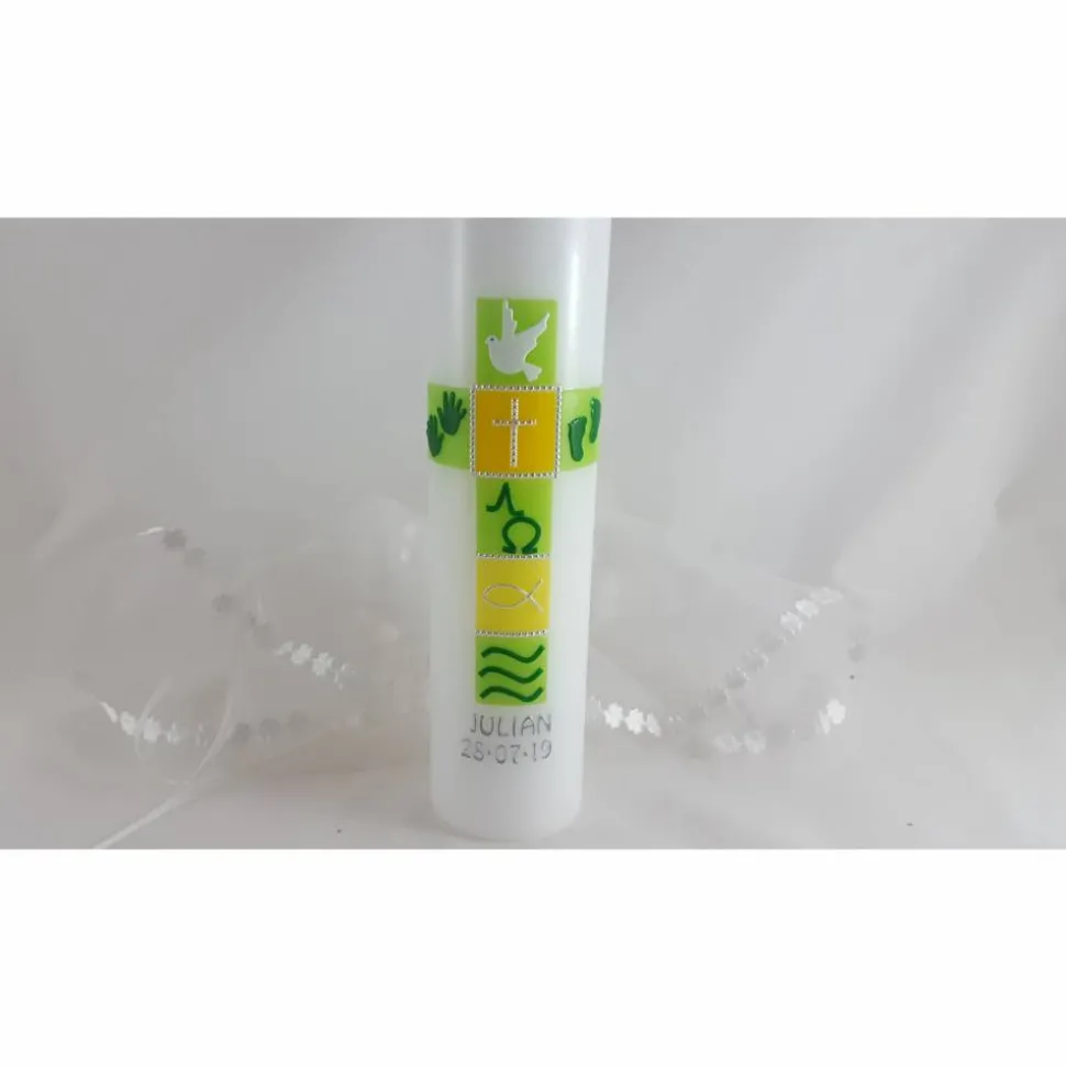 Die Symbole Taube, Kreuz, Alpha Omega, Hände und Füßchen, Fisch und Wellen können auf Wunsch auch geändert werden.