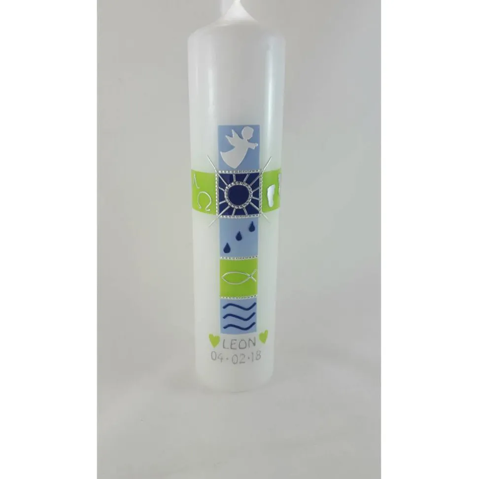 Das Motiv dieser Taufkerze wird aus Wachs gefertigt, Name und Datum werden mit Konturenstickern aufgebracht.