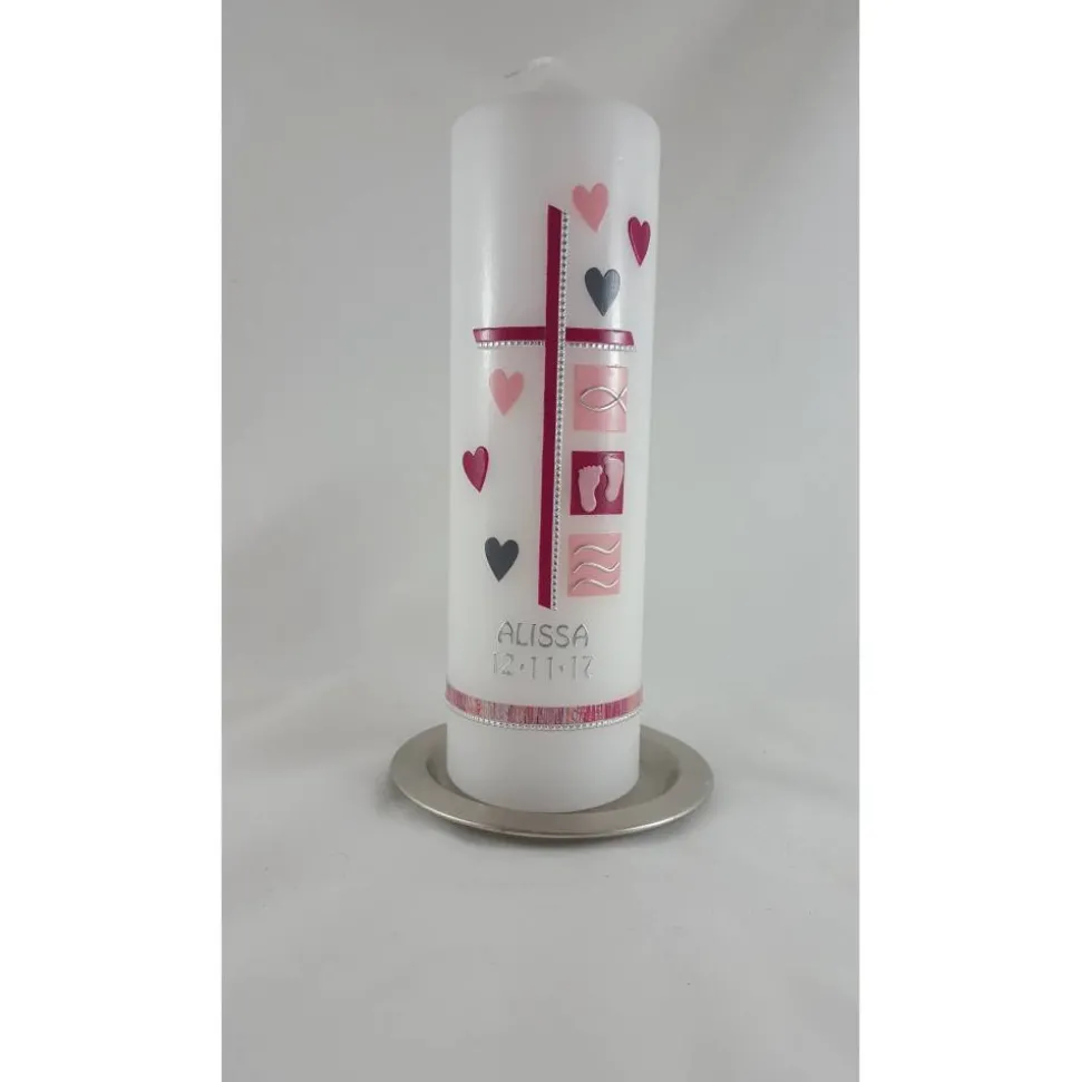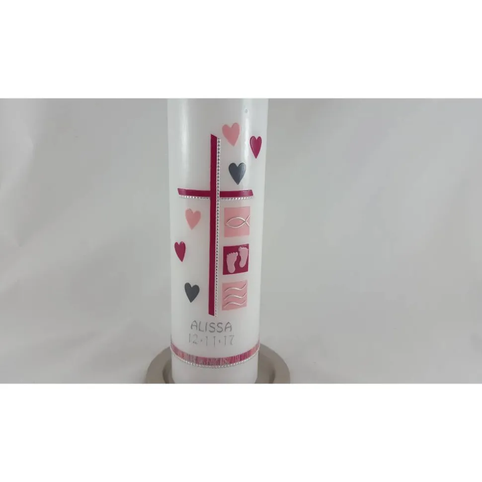 die Herzen geben der Taufkerze einen verspielten, romantischen Touch