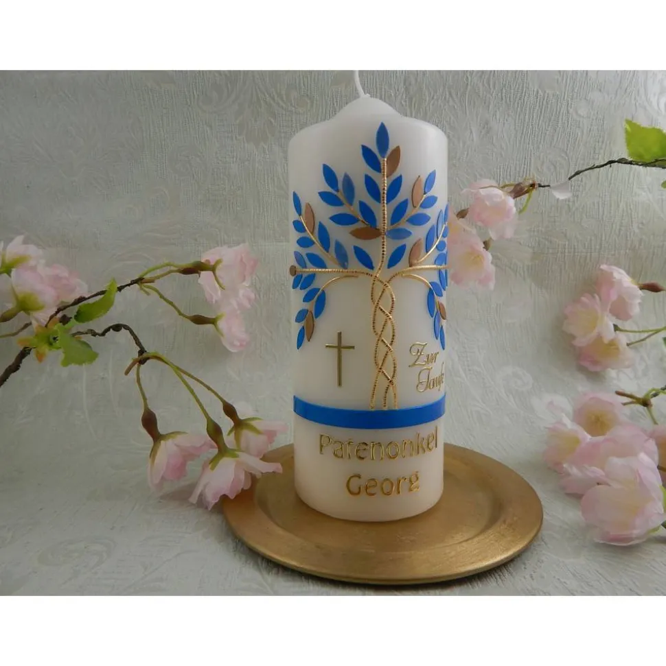 Taufkerze Jungen Lebensbaum blau gold Baum des Lebens Regenbogen Fische Sonne Name Datum Spruch individualisierbar