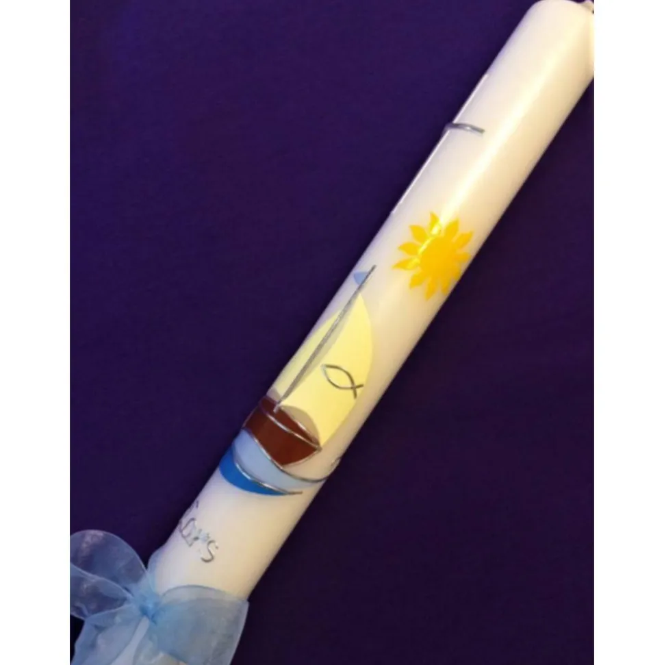 Taufkerze oder Kommunionskerze „Mit Jesus in einem Boot.“ mit hochwertigen Wachsverzierungen