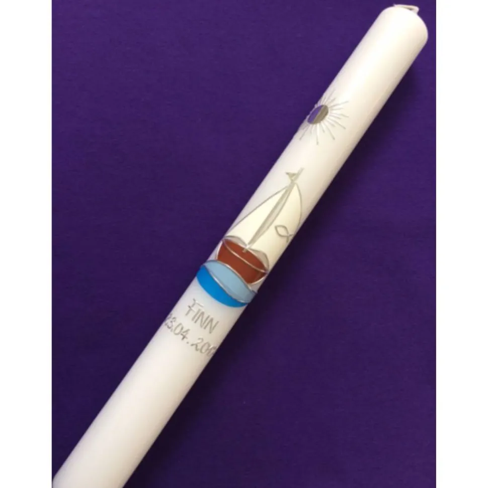 Taufkerze oder Kommunionskerze „Mit Jesus in einem Boot.“ mit hochwertigen Wachsverzierungen
