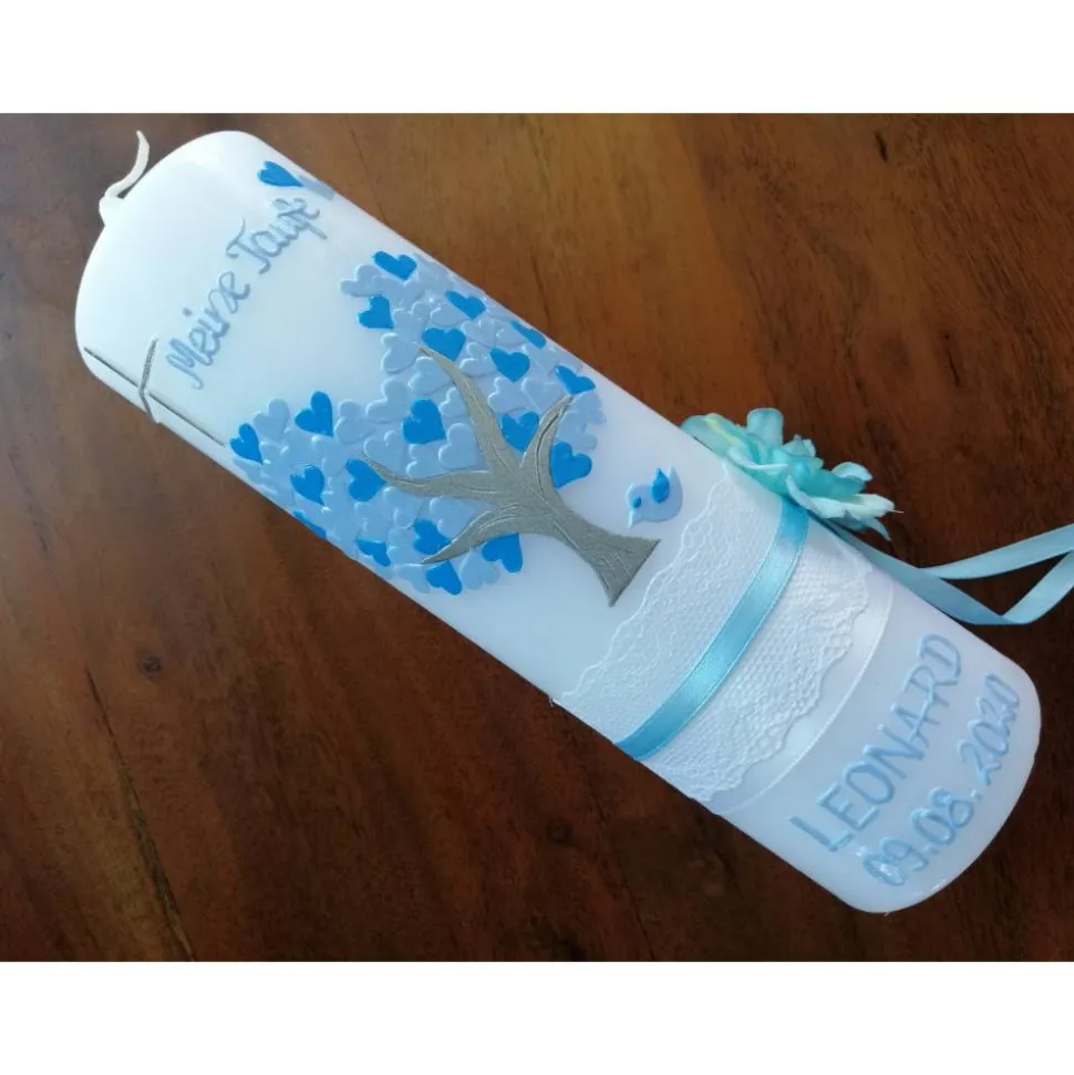 Taufkerze oder Kommunionskerze Lebensbaum Baum Kreuz mit hochwertigen Wachsverzierungen
