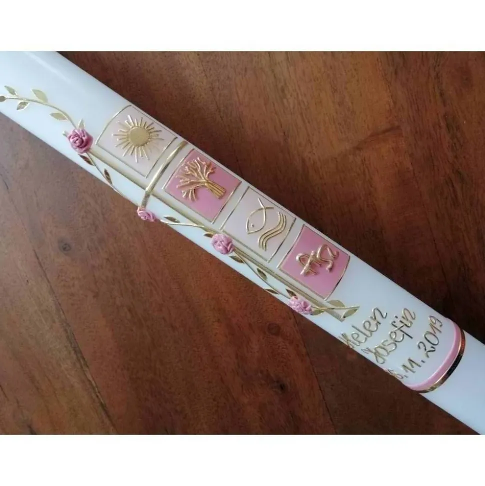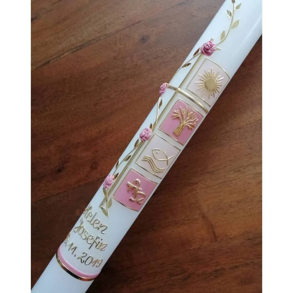 Die Verzierung auf der Kerze wird in liebevoller Handarbeit für Sie erstellt.