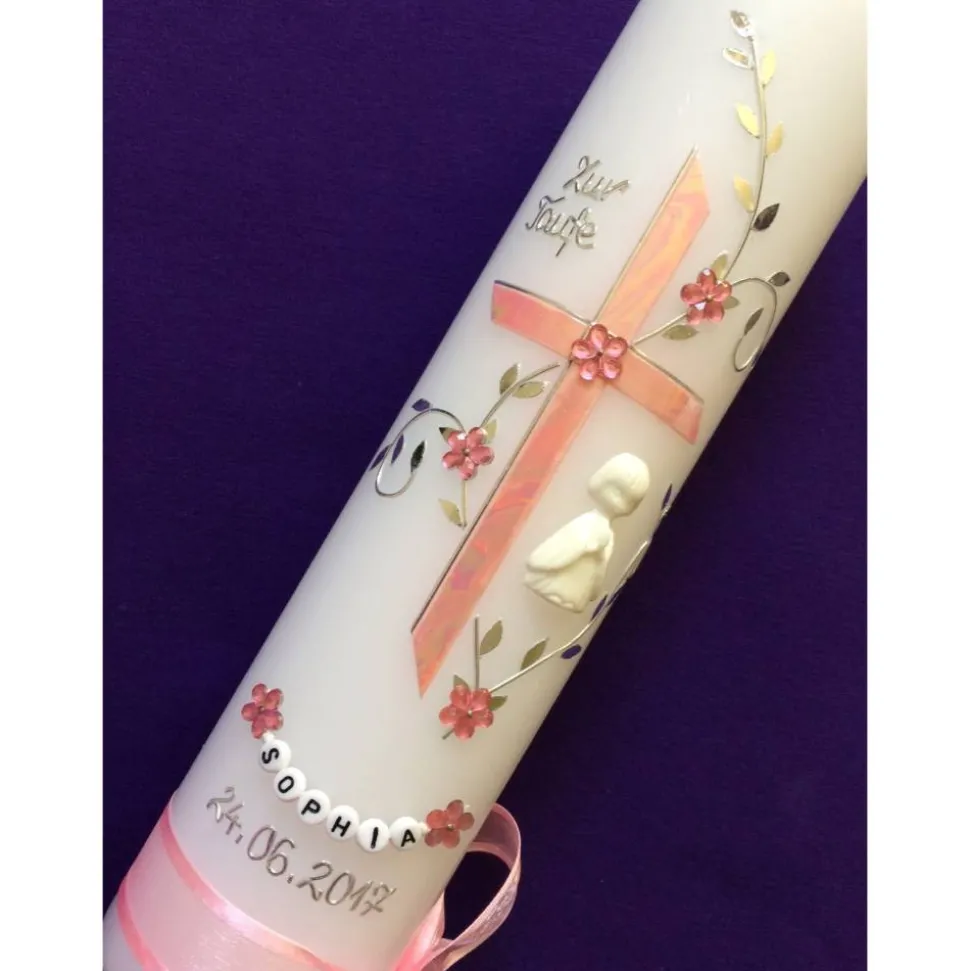 Taufkerze Kreuz mit hochwertigen Wachsverzierungen und Beschriftung aus Buchstabenperlen