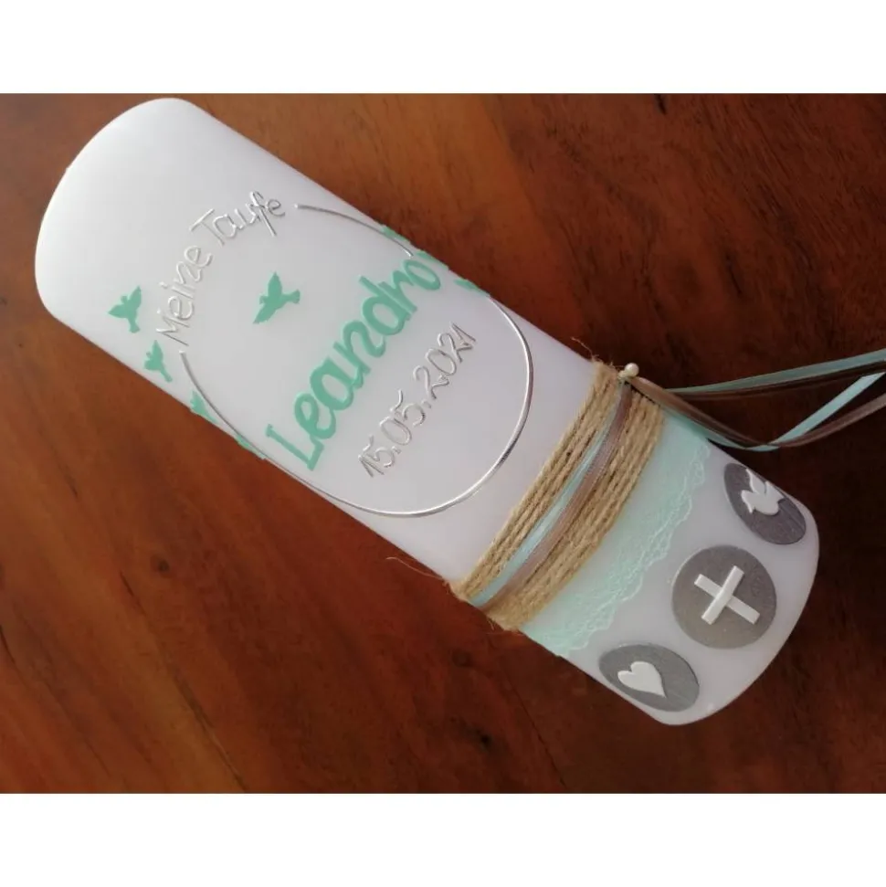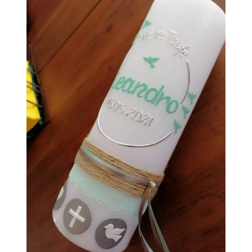 Die Taufkerze kann Ihren Wünschen entsprechend beschriftet werden.
