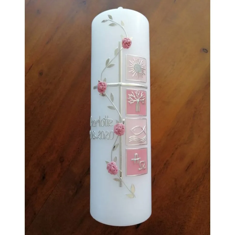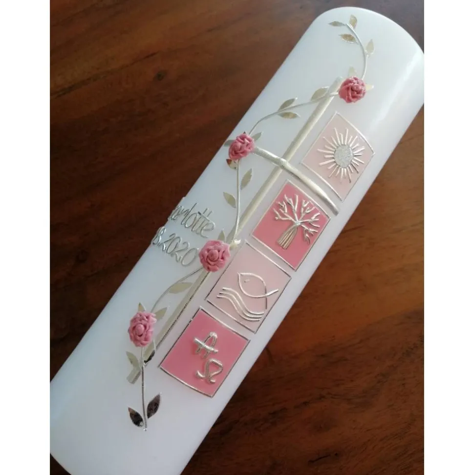 Taufkerze Kreuz mit hochwertigen Wachsverzierungen