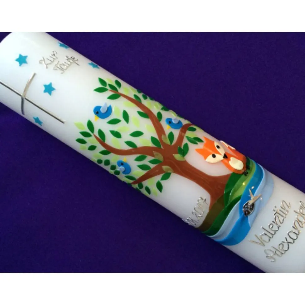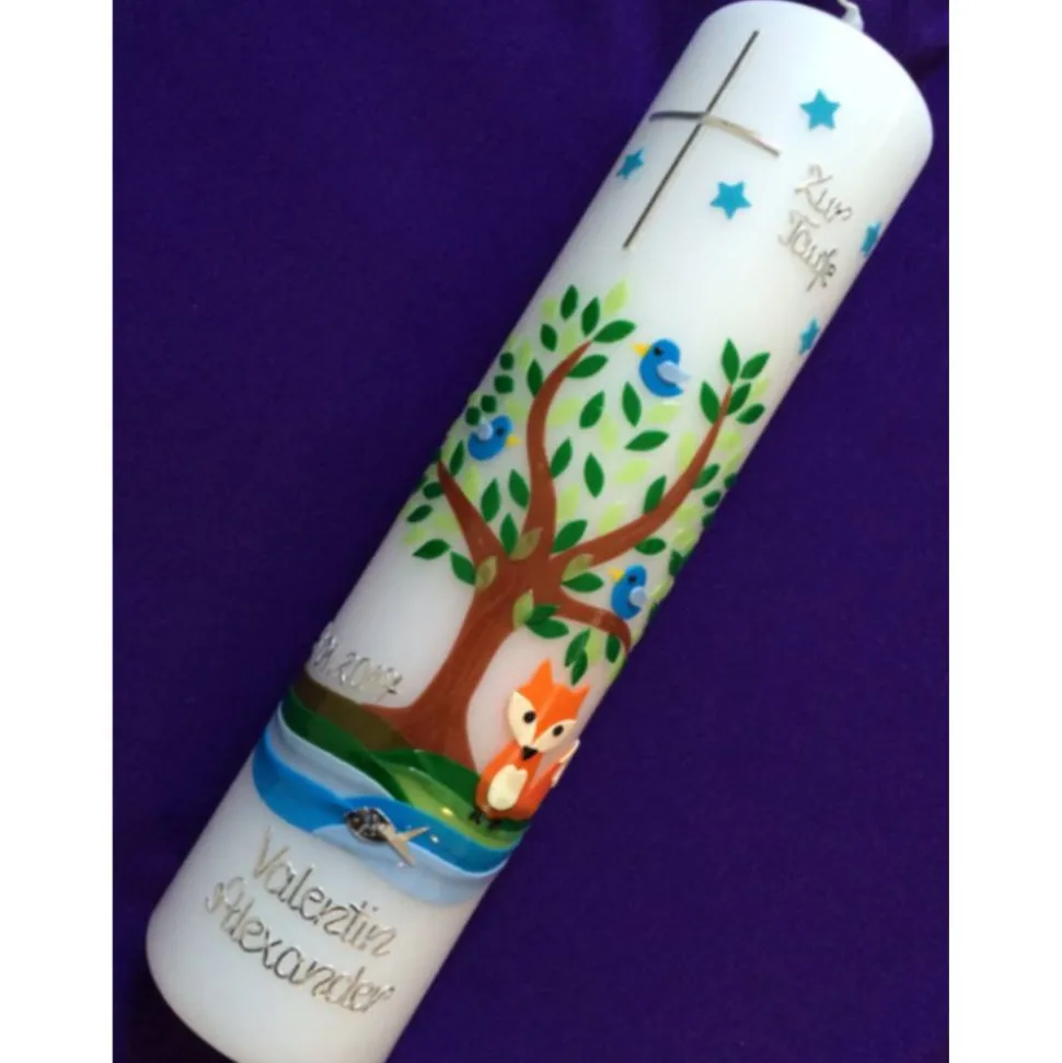 Taufkerze Lebensbaum mit Fuchs mit hochwertigen Wachsverzierungen