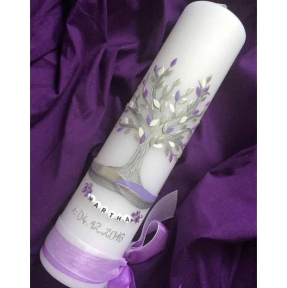 Taufkerze Lebensbaum mit hochwertigen Wachsverzierungen und Beschriftung aus Buchstabenperlen