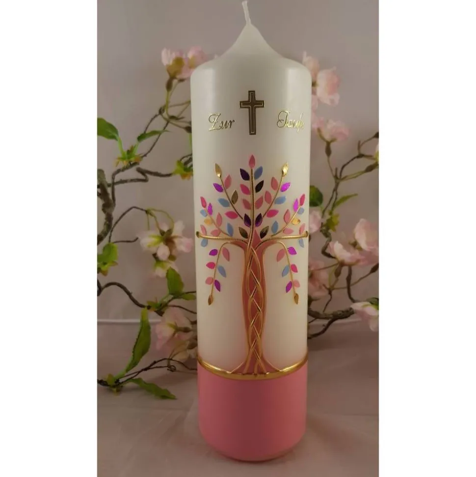 Taufkerze Mädchen Lebensbaum rosa gold Baum des Lebens Regenbogen Namenskette Name Datum Spruch individualisierbar
