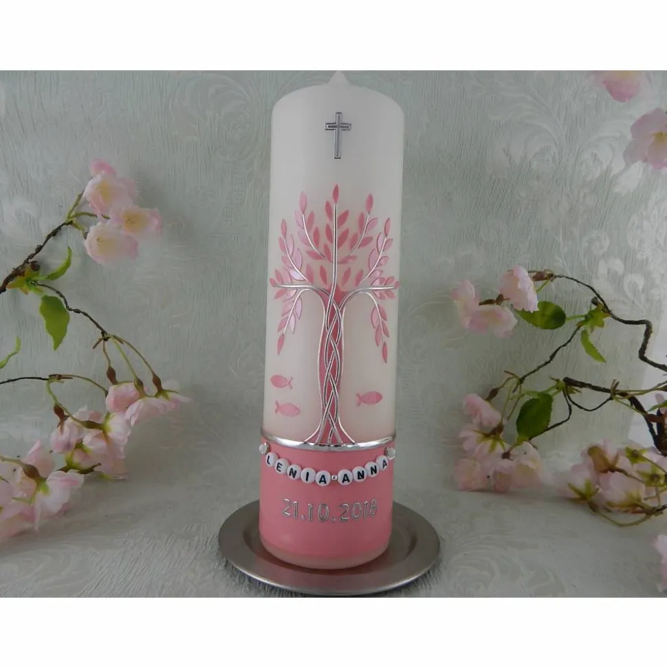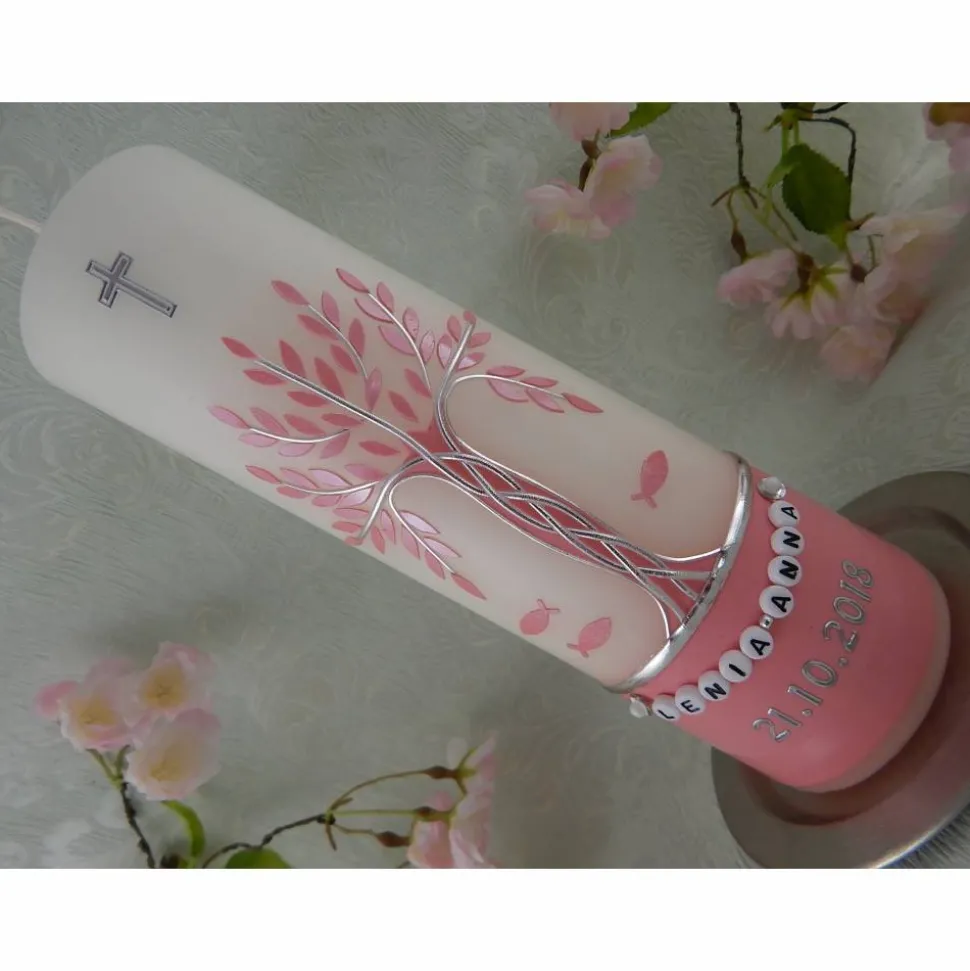 Taufkerze Mädchen Lebensbaum rosa silber Baum des Lebens Fische Namenskette Name Datum Spruch individualisierbar