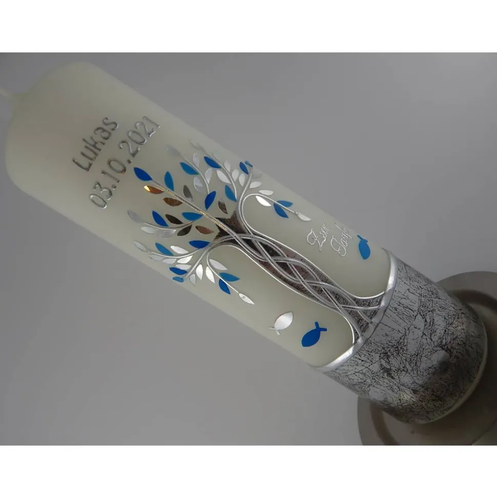Taufkerze Mädchen Lebensbaum silber blau Baum des Lebens Regenbogen Namenskette Name Datum Spruch individualisierbar