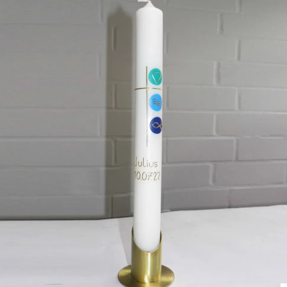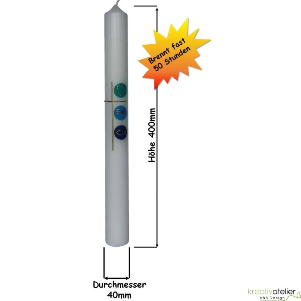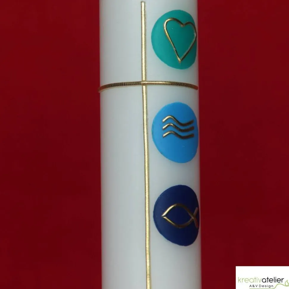 Schlicht und elegant von Hand verzierte Taufkerze in elfenbein mit drei Kacheln in verschiedenen Blau- und Türkistönen, die die christlichen Symbole in gold zeigen. Die Symbole werden mit einem feinen Goldstreifen von Hand auf die farbigen Kacheln aufgebracht. Die Kacheln wurden zuvor einzeln von Hand aus verschiedenen Wachsplatten ausgeschnitten. Beides zusammen wird kunstvoll zu einem Gesamtbild auf der Kerze arrangiert.