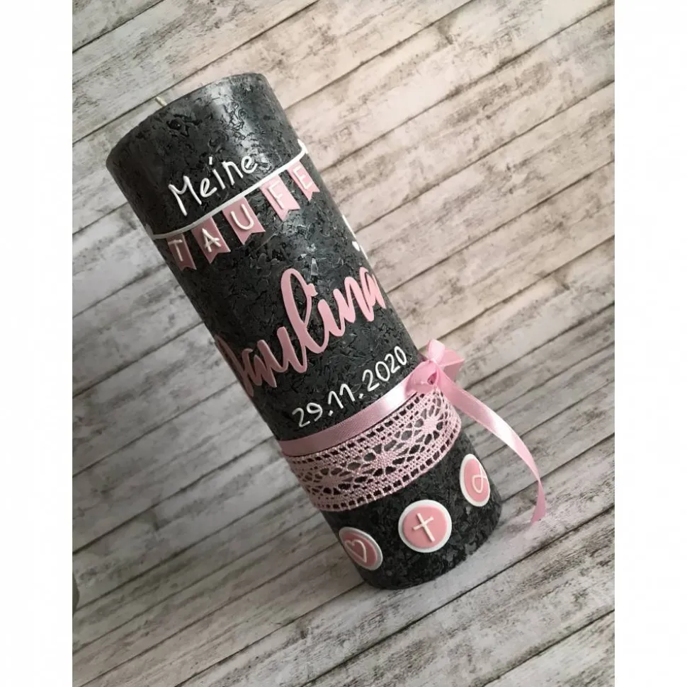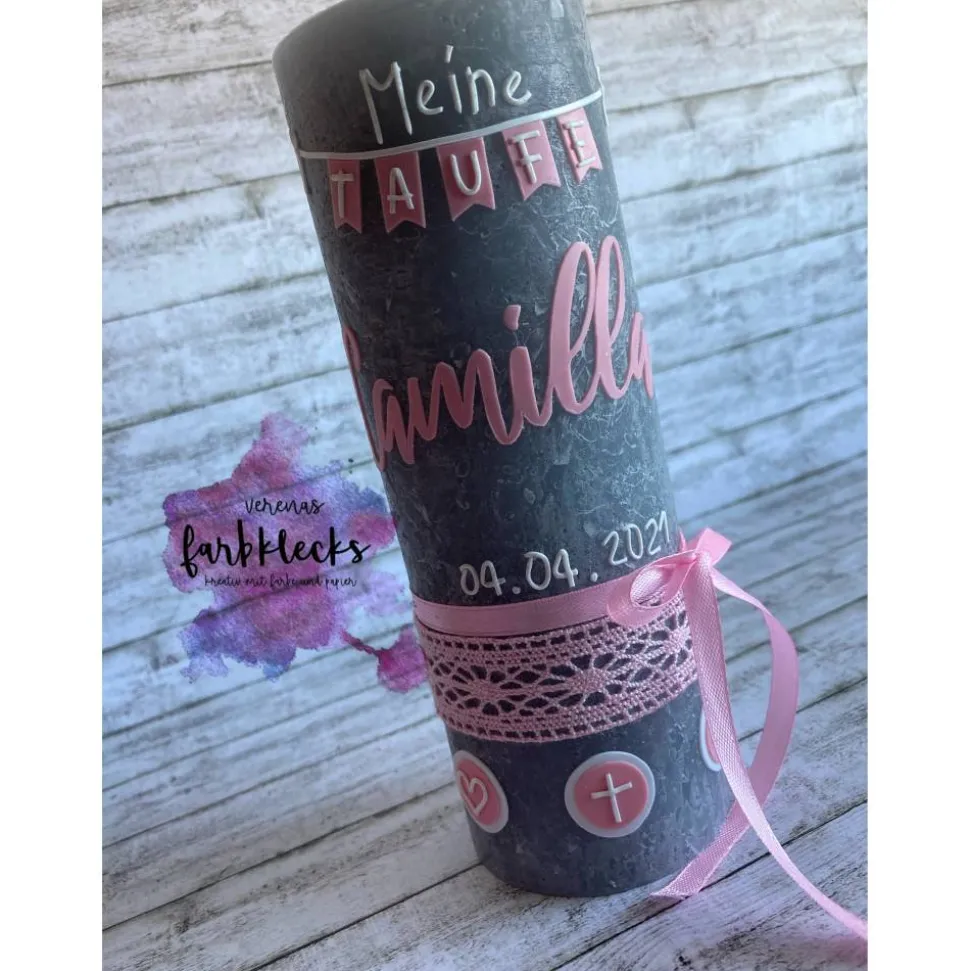 Liebevoll von Hand gestalltet, verziehrt mit Name und Tauf- oder Geburtsdatum.
