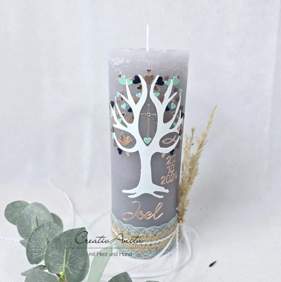 Handverzierte Kerze mit Lebensbaum und Herzen. Im Lebensbaum befinden sich die Symbole Kreuz, Taube, Fisch.