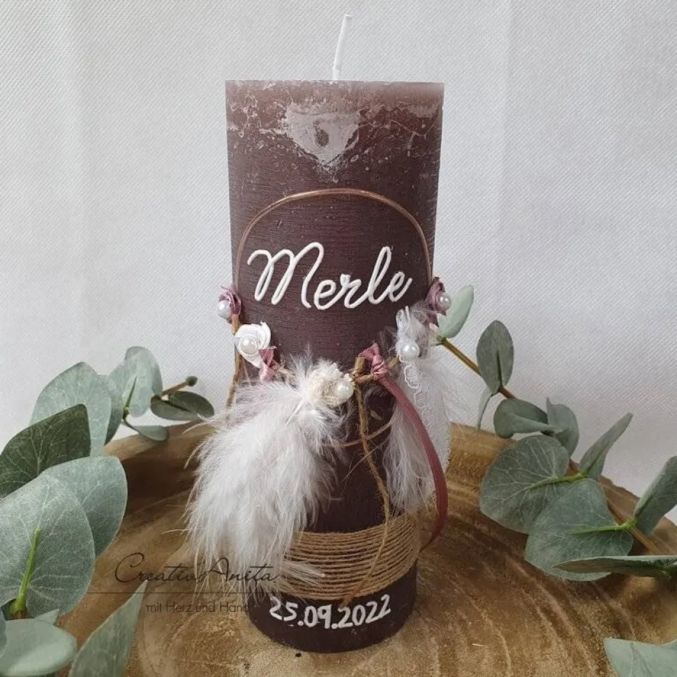 Tolle Taufkerze – Rustikkerze in Taupe und im Boho-Stil – Romantisch! Handverzierte Kerze mit Spitzenbändern, Röschen und Feder. Gerne personalisieren wir die Kerze auch mit dem Namen des Täuflings und das Taufdatum. Bitte teilen Sie uns dies entsprechend mit.