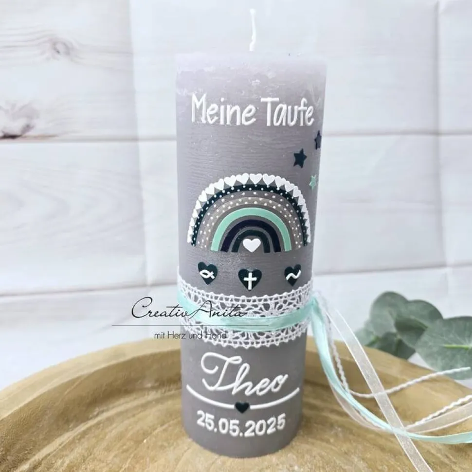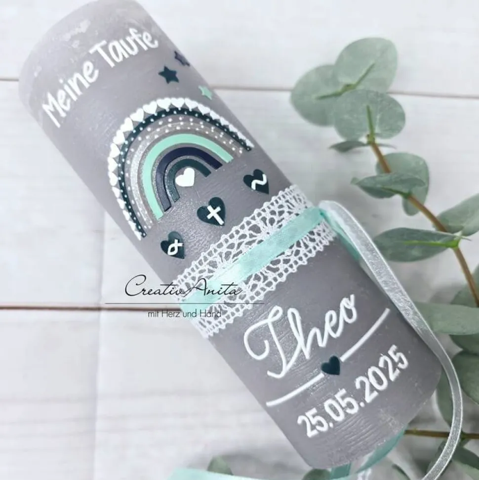Gerne personalisieren wir die Kerze auch mit dem Namen des Täuflings und das Taufdatum.