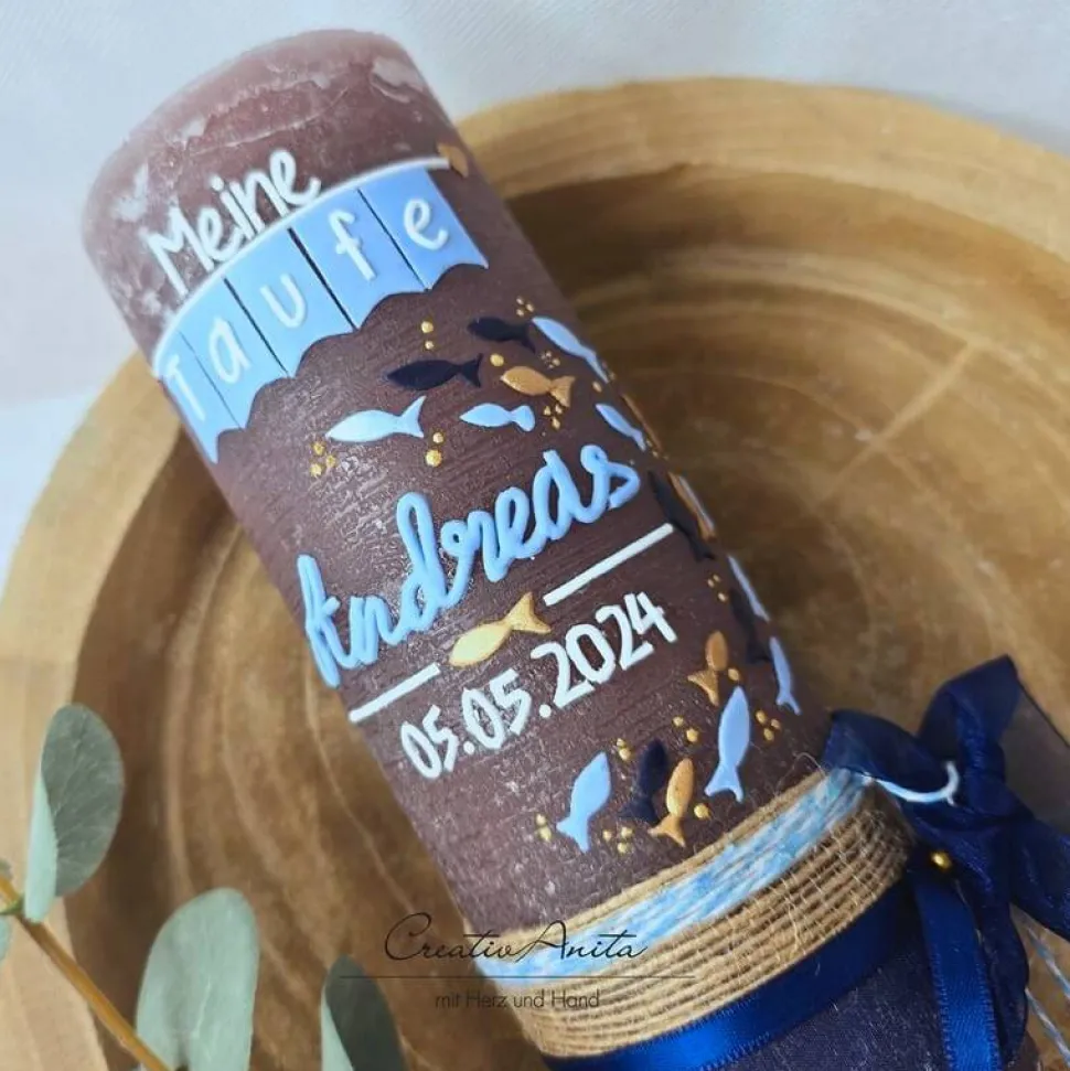 Gerne personalisieren wir die Kerze auch mit dem Namen des Täuflings und das Taufdatum.