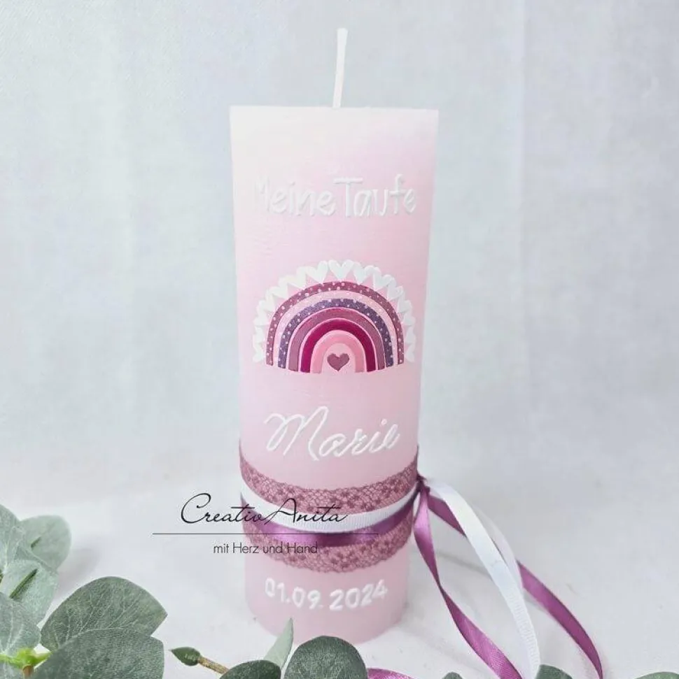 Tolle Taufkerze – Rustikkerze in Rosé mit trendigem Regenbogen aus Herzen.
