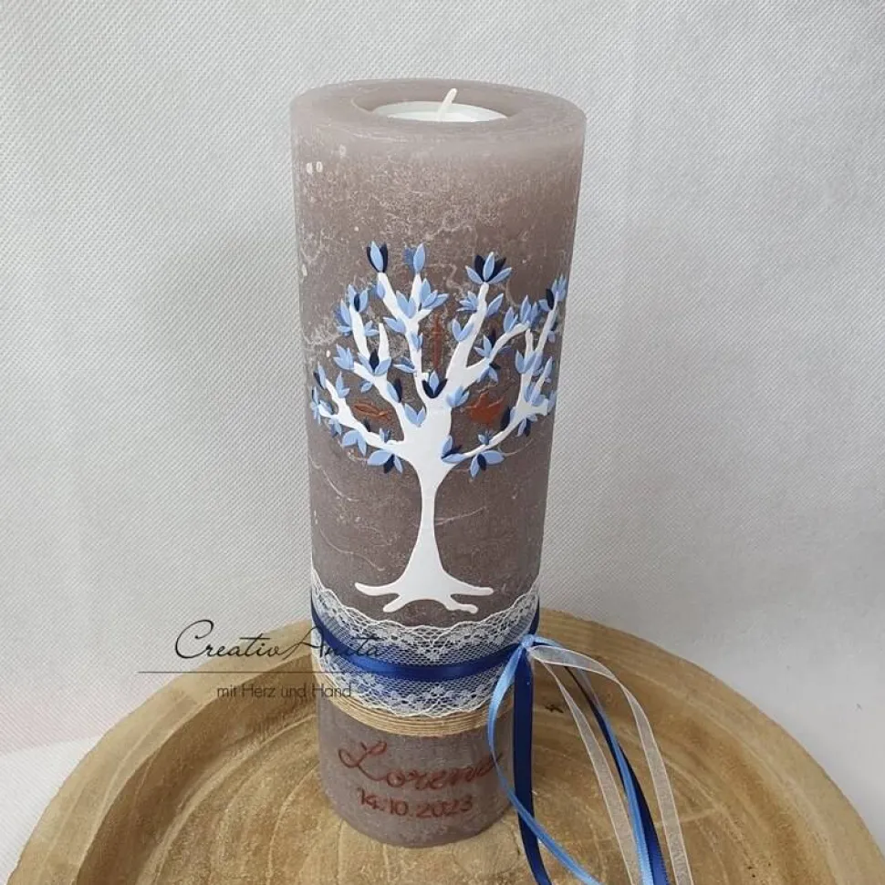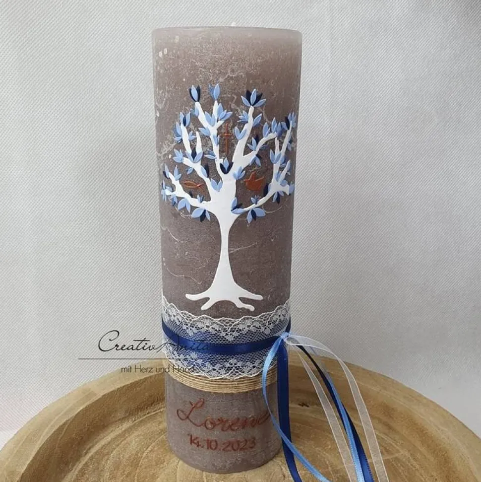 Handverzierte Kerze mit Lebensbaum und christliche Symbole, die sich im Baum befinden (Fisch, Kreuz, Taube).