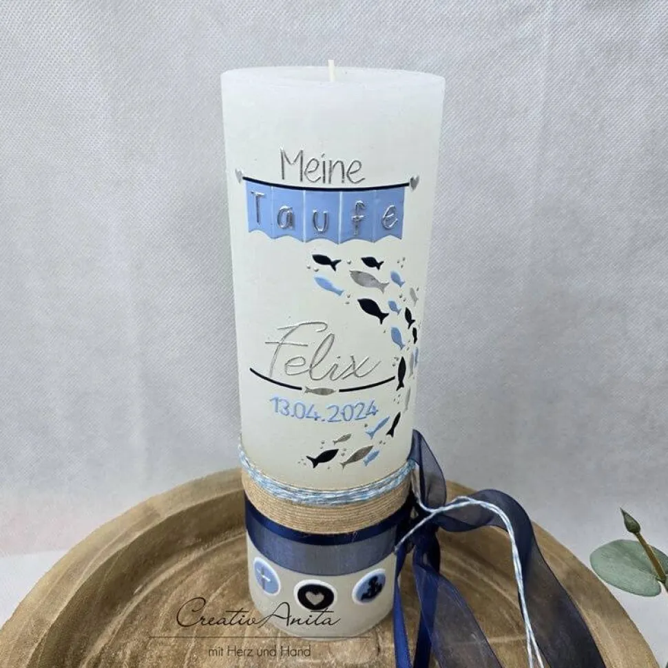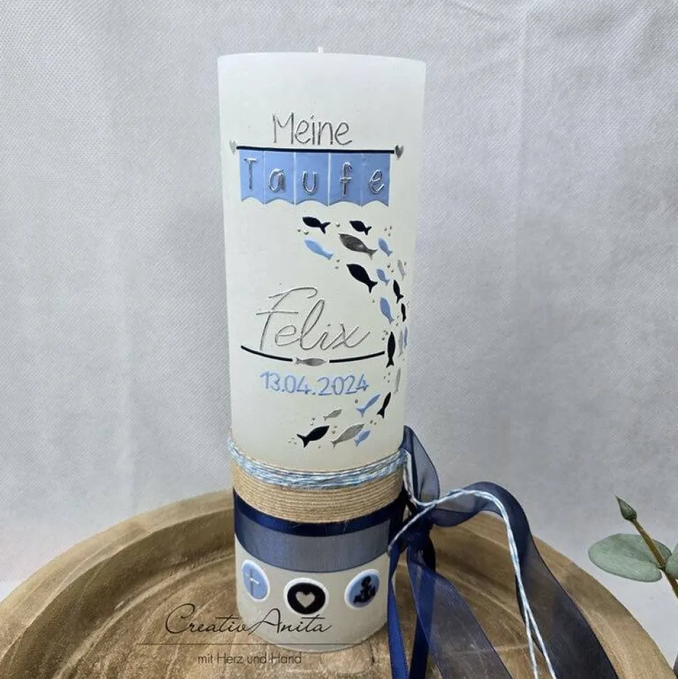 Handverzierte Kerze mit verschieden großen Fischen in den Farben Hell- und Dunkelblau und Silber glanz.