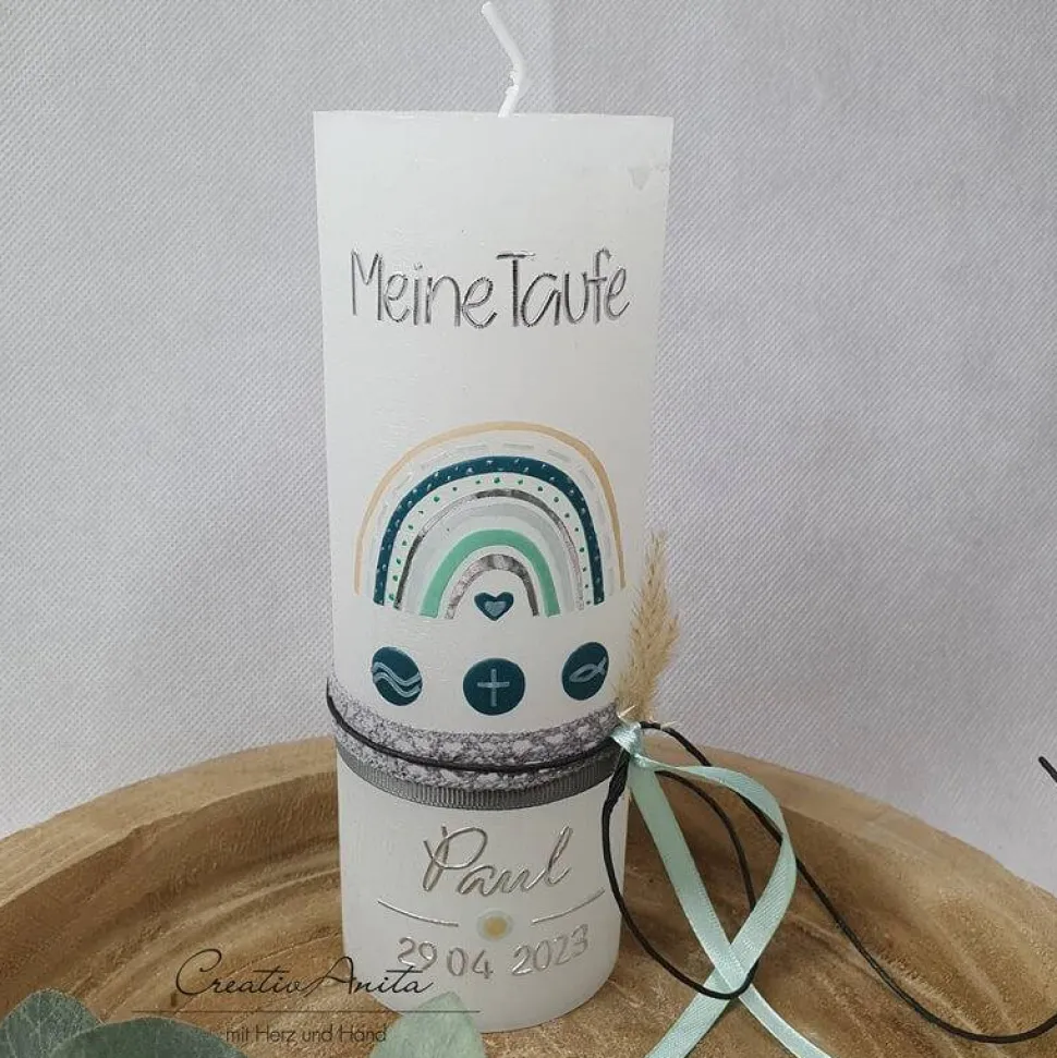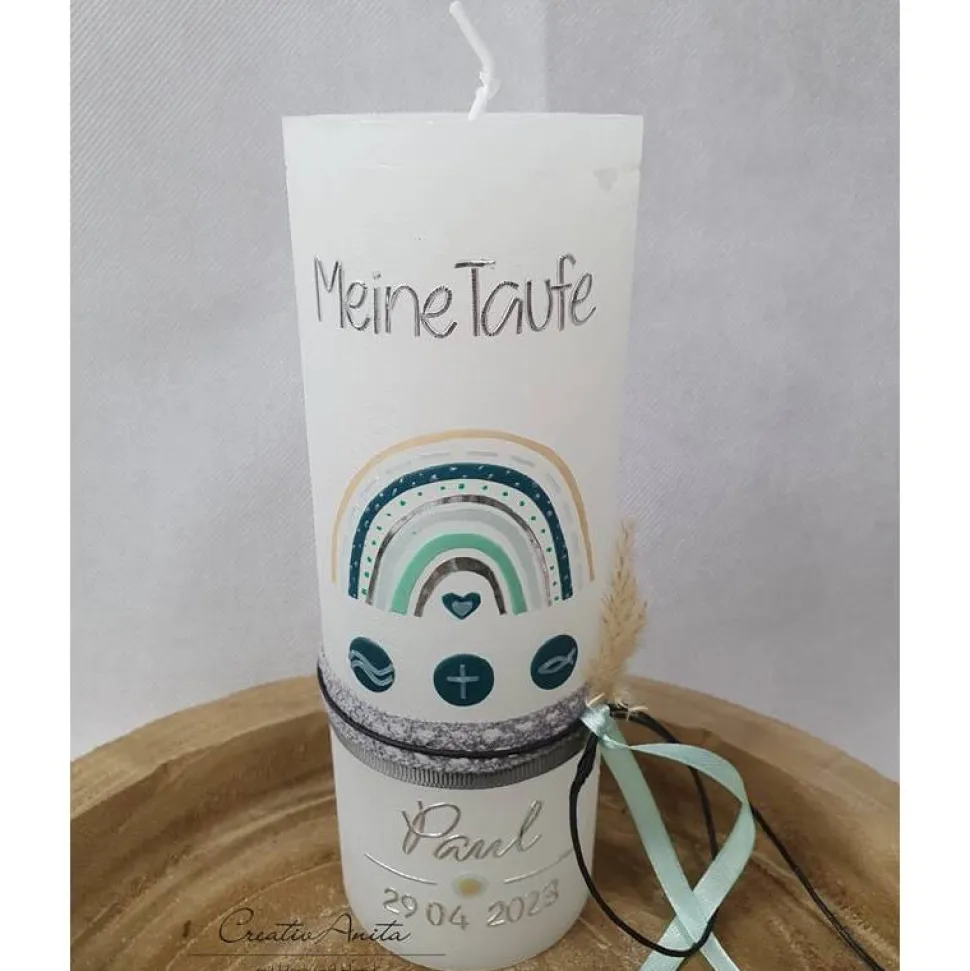 Tolle Taufkerze – Rustikkerze in Weiß mit trendigem Regenbogen.
