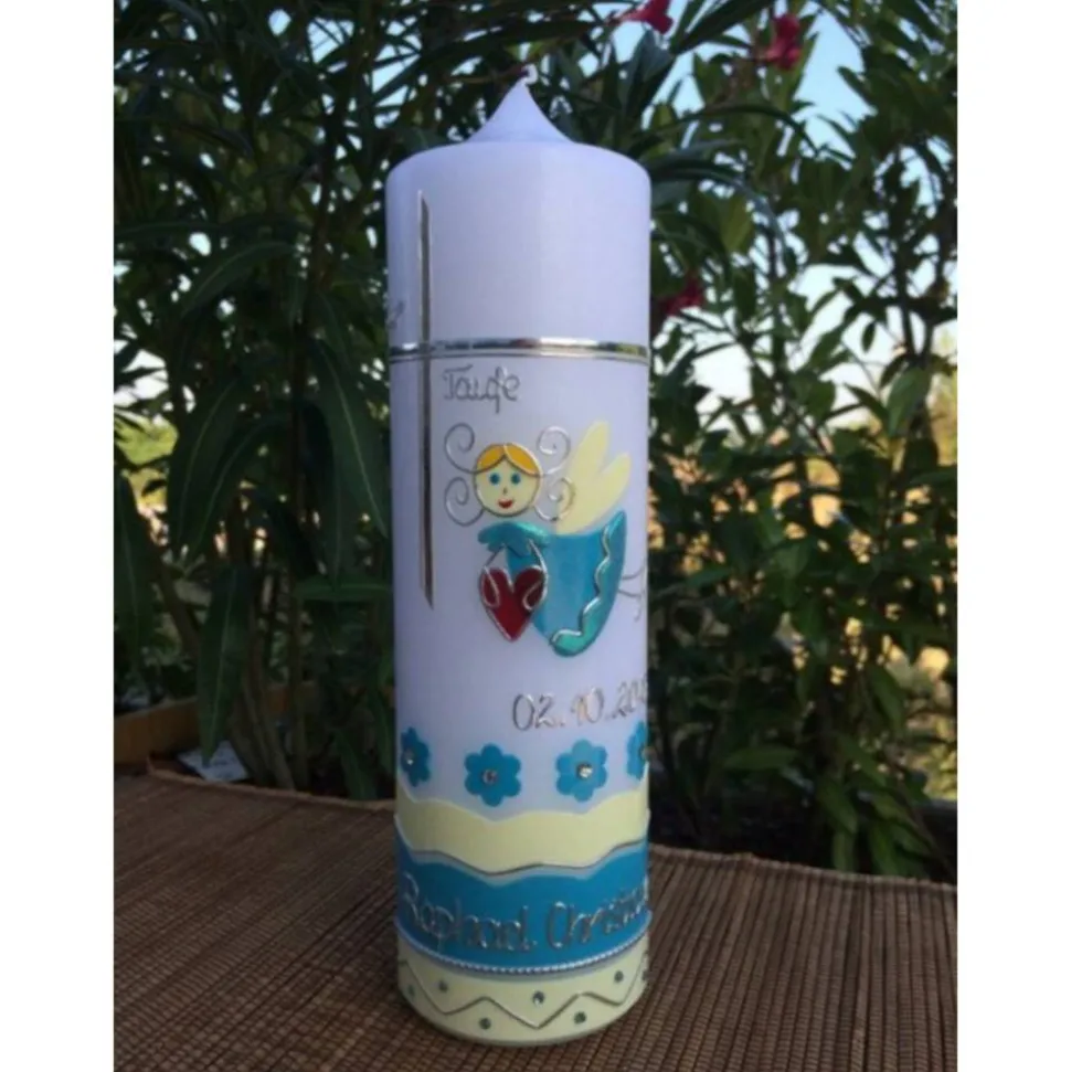 Taufkerze Schutzengel mit hochwertigen Wachsverzierungen