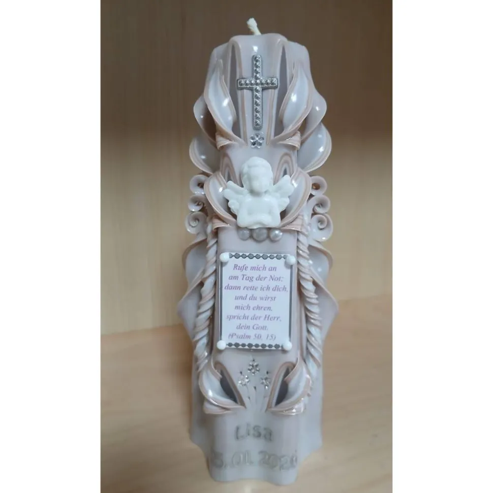 Die Schnitzereien an der Kerze lassen das Licht hindurch scheinen, wodurch die Kerze eine ganz besondere Atmosphäre ausstrahlt.