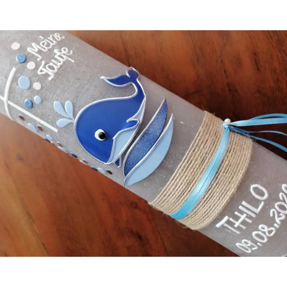 Taufkerze Wal – Fisch – mit hochwertigen Wachsverzierungen