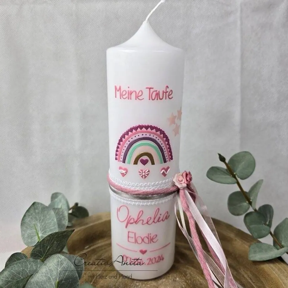 Gerne personalisieren wir die Kerze auch mit dem Namen des Täuflings und das Taufdatum.