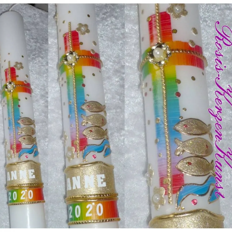 Im Mittelpunkt des Motivs steht das Kreuz welches wir in den typischen Regenbogenfarben gestaltet haben. Weitere christliche Elemente, die die Kerze schmücken, sind das Fisch- und Wassersymbol. Die Regenbogenfarben werden durch goldfarbenes Wachs verstärkt und ergeben eine harmonische farbenfrohe Farbgestaltung dieser Kerze.