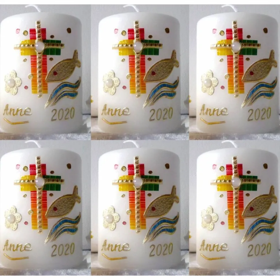 Bei dem angebotenen SET handelt es sich um eine lange farbenfroh gestaltete Tauf-oder Kommunionskerze mit Kreuz-Symbol in Vollwachsauflage.und 6 Stck passende Gastgeschenke-Kerzchen als kleines Dankeschön und zur Erinnerung für Ihre Gäste.