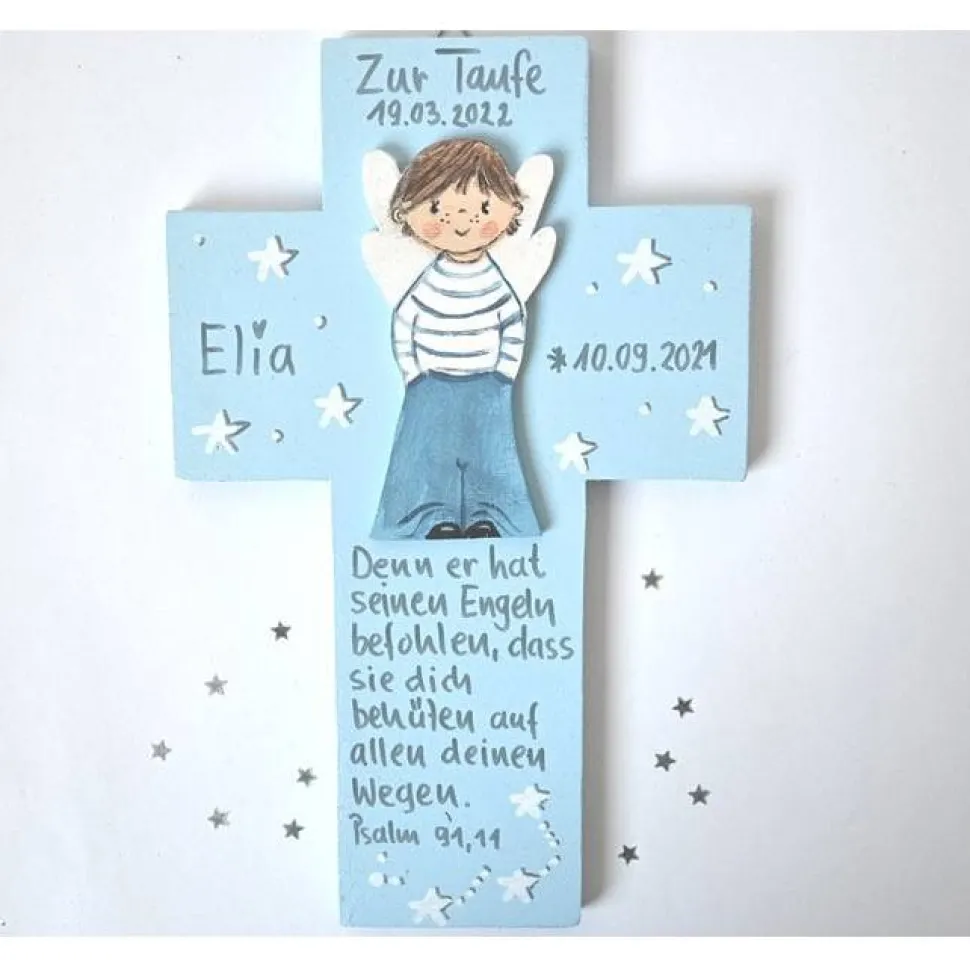 Jedes Taufkreuz wird individuell nach Ihren Wünschen gestaltet. Es wird von Hand ausgesägt und mit hochwertigen Künstleracrylfarben vorder- und rückseitig bemalt. Kein Druck, kein Laser, kein Kleben – nur echte Handarbeit mit viel Liebe zum Detail! Der Schutzengel wird separat gefertigt und aufgeklebt, Ihr Wunsch-Schutzengelspruch wird in Handschrift angebracht.