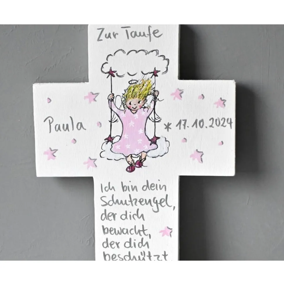 Taufkreuz für Mädchen – liebevoll handgefertigt und individuell bemalt, ein wunderschönes Geschenk zur Taufe, Geburt oder zum Geburtstag. Das Holzkreuz misst 22 x 14 x 1 cm und wird von Hand ausgesägt, vorder- und rückseitig mit hochwertigen Künstleracrylfarben bemalt und anschließend mit deinem Wunschengel und einem persönlichen Schutzengelspruch veredelt.