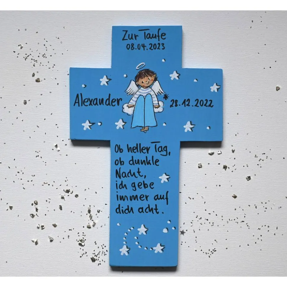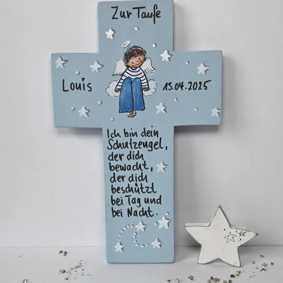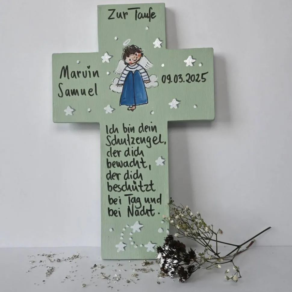 Ihr persönlicher Schutzengel und Ihr Wunsch-Spruch werden per Hand aufgebracht – nichts wird gedruckt, gelasert oder geklebt! Als Schutz wird das Kreuz zweimal mit Acryllack versiegelt, damit es lange Freude bereitet.