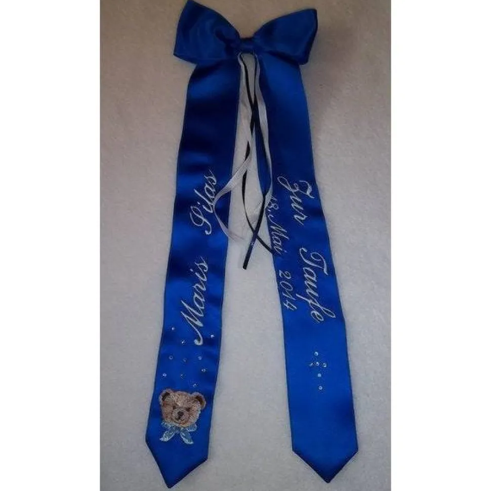 Die Schleife in der Abbildung ist 5 cm breit und aus Satinband, das nach Ihren Angaben bestickt wird, sowie einem schmalen Zierband.