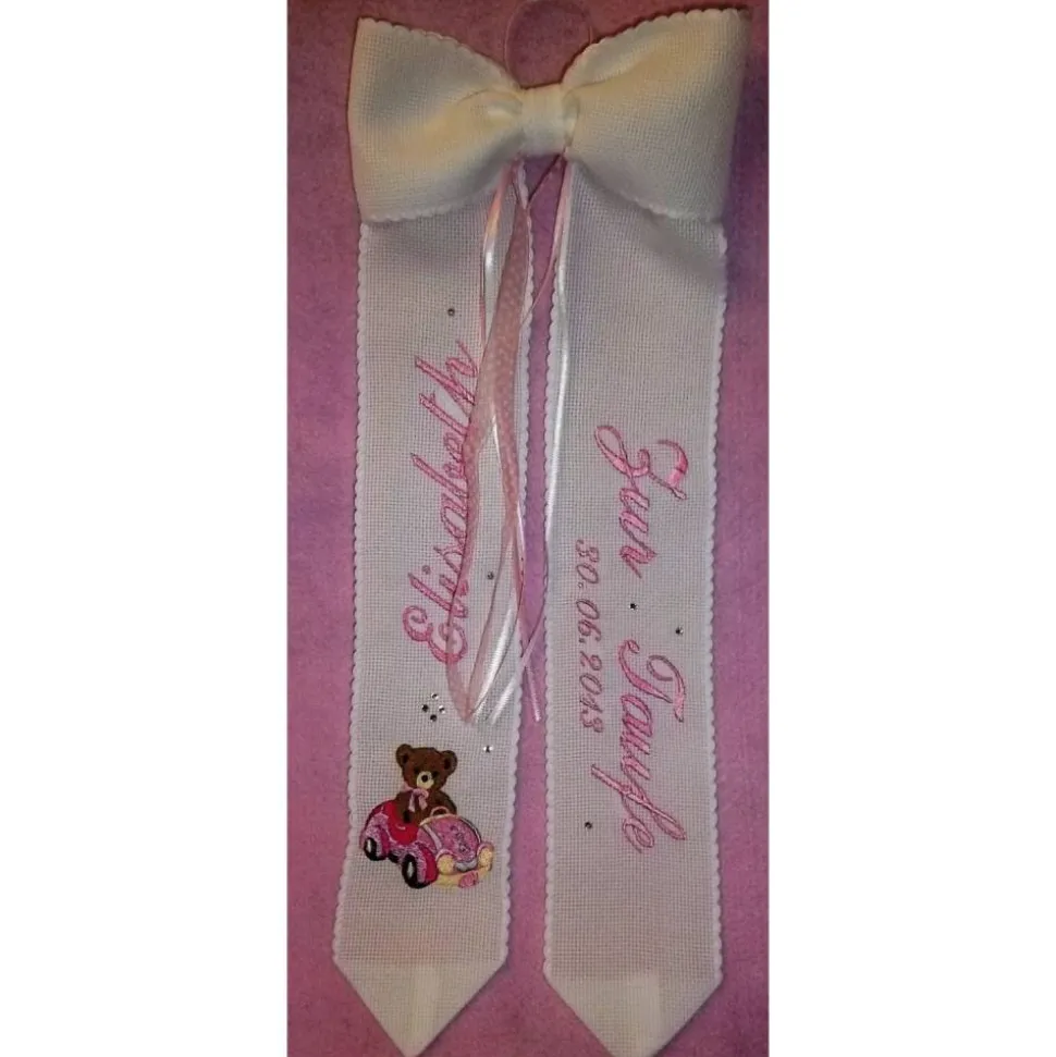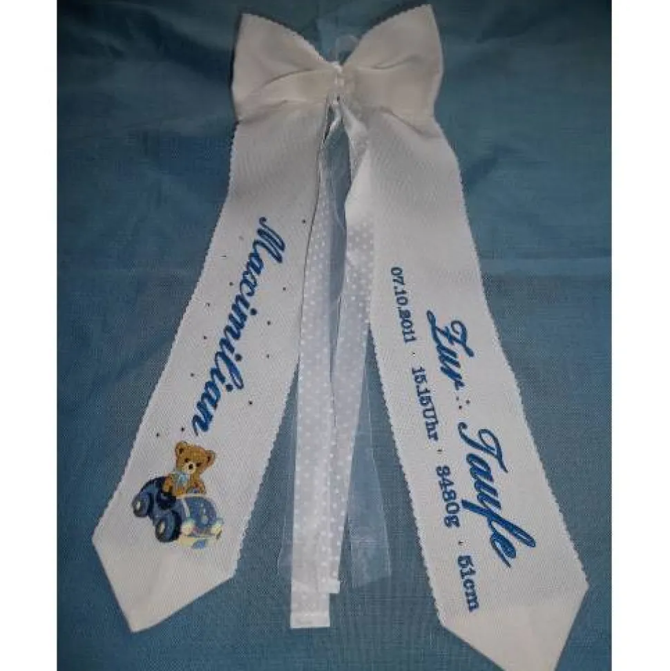 Die Schleife aus Baumwollband, das nach Ihren Angaben bestickt wird, sowie einem duftigen Zierband. Das Band ist aus Baumwolle und es gibt das Band nur noch in weiß.