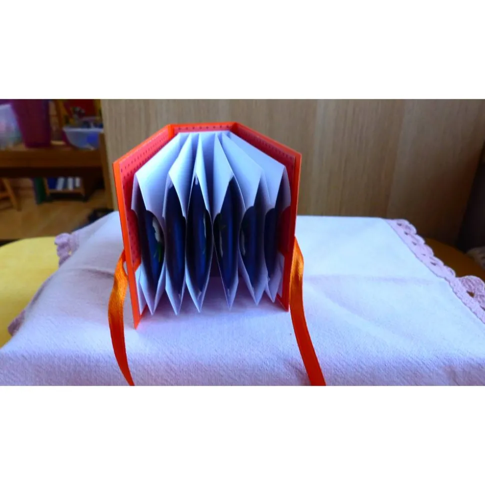 Das Büchlein ist aus orangen Farbkarton und einem bedruckten Motivkarton gearbeitet.