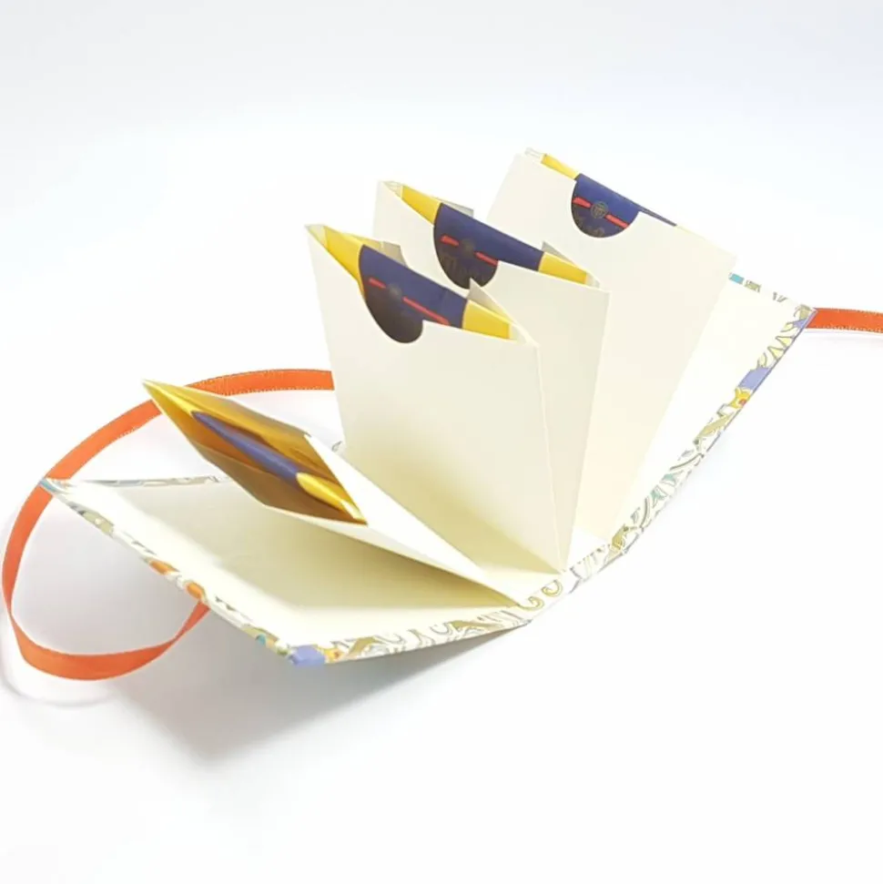 Die Decke des Teebeutelbuches besteht aus 1,5mm Buchbindergraupappe, überzogen mit einem Buntpapier im Stil der 50er. So kann in der Handtasche auch ruhig mal etwas schwereres darauf liegen, es verknickt nichts.