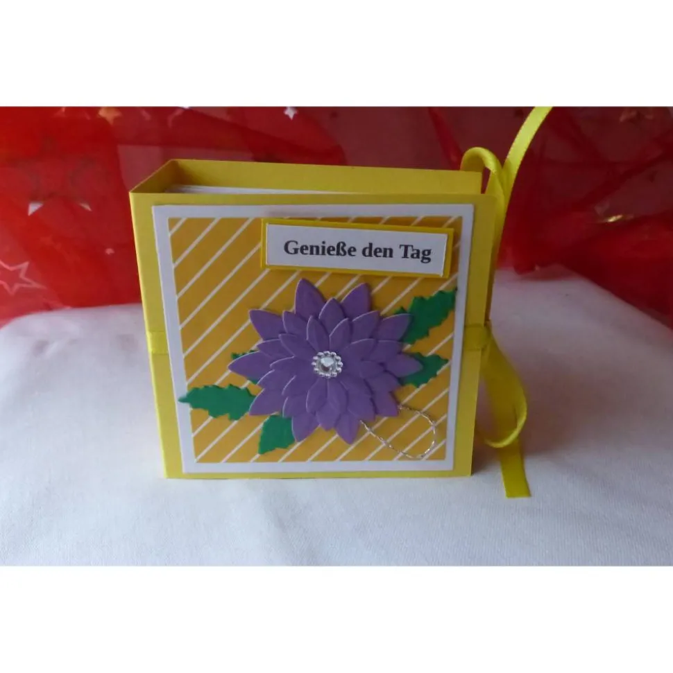 Das Büchlein ist aus einen Farbkarton in gelb,weiß und einem gestreiften Motivkarton gearbeitet.