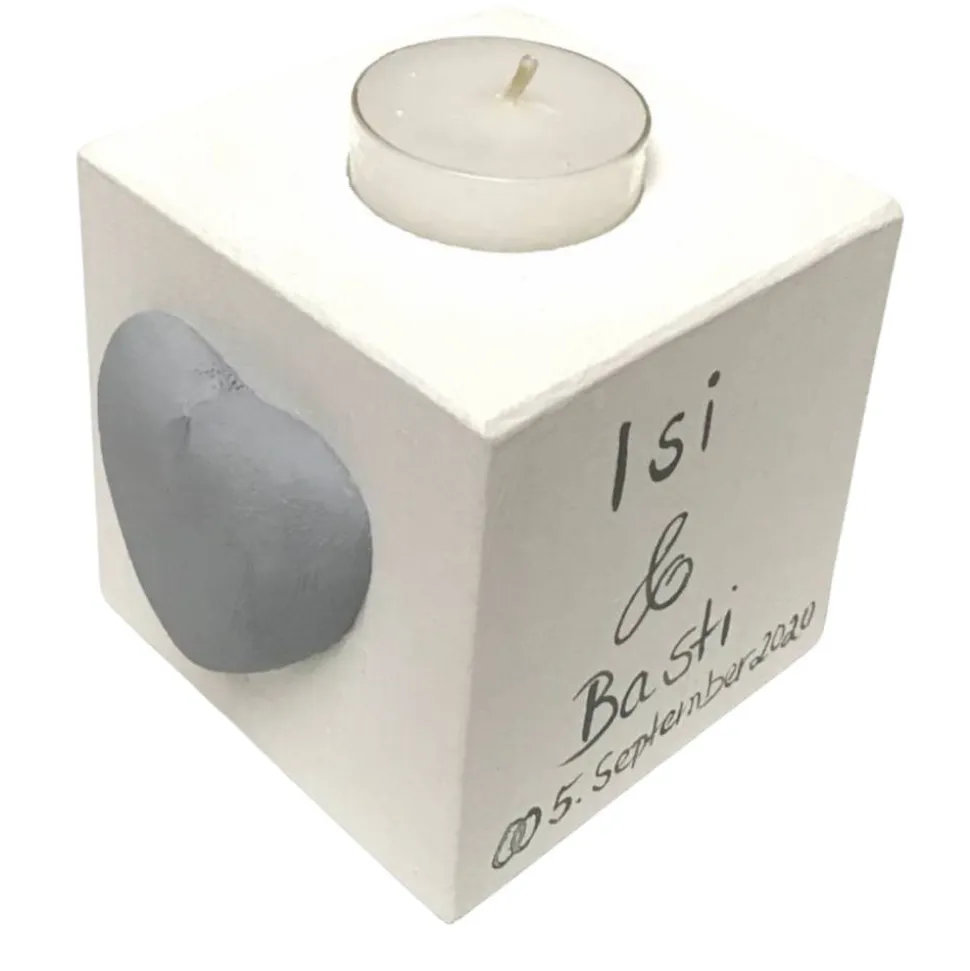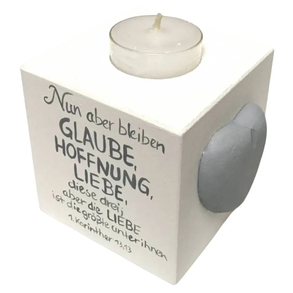 Jeder Kerzenwürfel wird nach dem Kauf individuell für Sie bemalt. Die Teelichthalter können mit Namen,Daten, christlichem oder persönlichem Vers personalisiert werden. Farbwünsche werden gerne berücksichtigt.