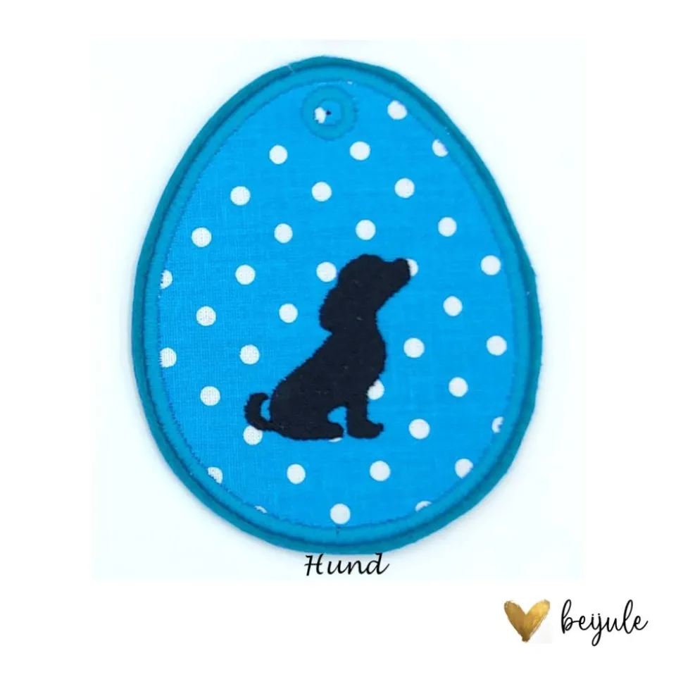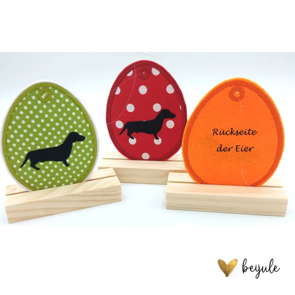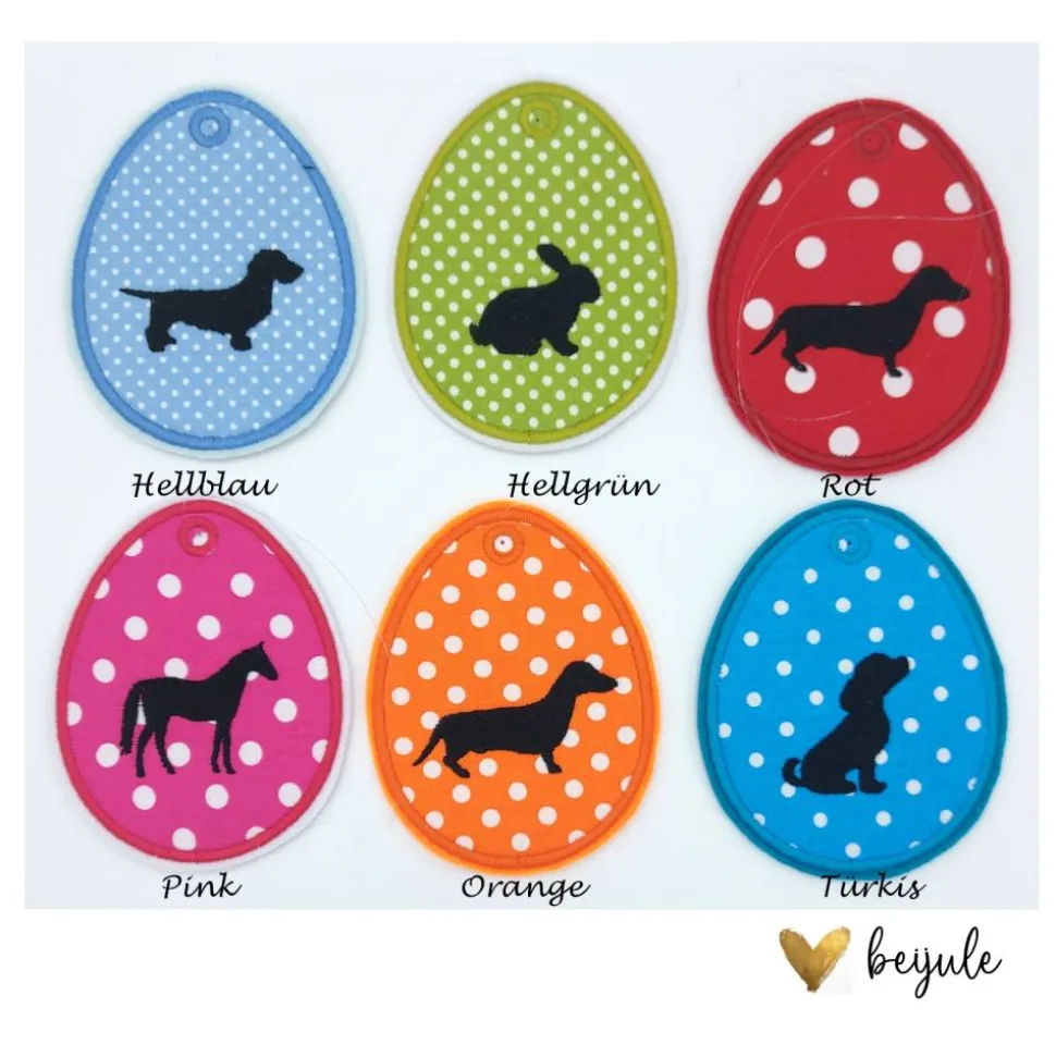 Auswahl der Tiere und der Eierfarben möglich. Die Punkte können unterschiedlich groß sein, je nach Stoffvorrat. Rückseite unifarbener Filz