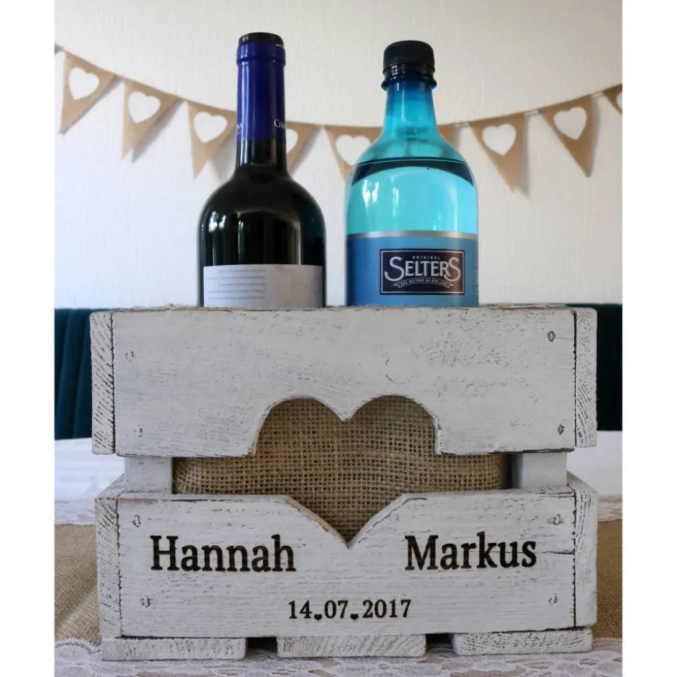 Die Vornamen des Brautpaares und das Hochzeitsdatum werden nach Wunsch -wie auf den Bildern- stilvoll auf dem Kistchen eingraviert. Ein ausgeschnitztes Herz verbindet die beiden Namen miteinander.