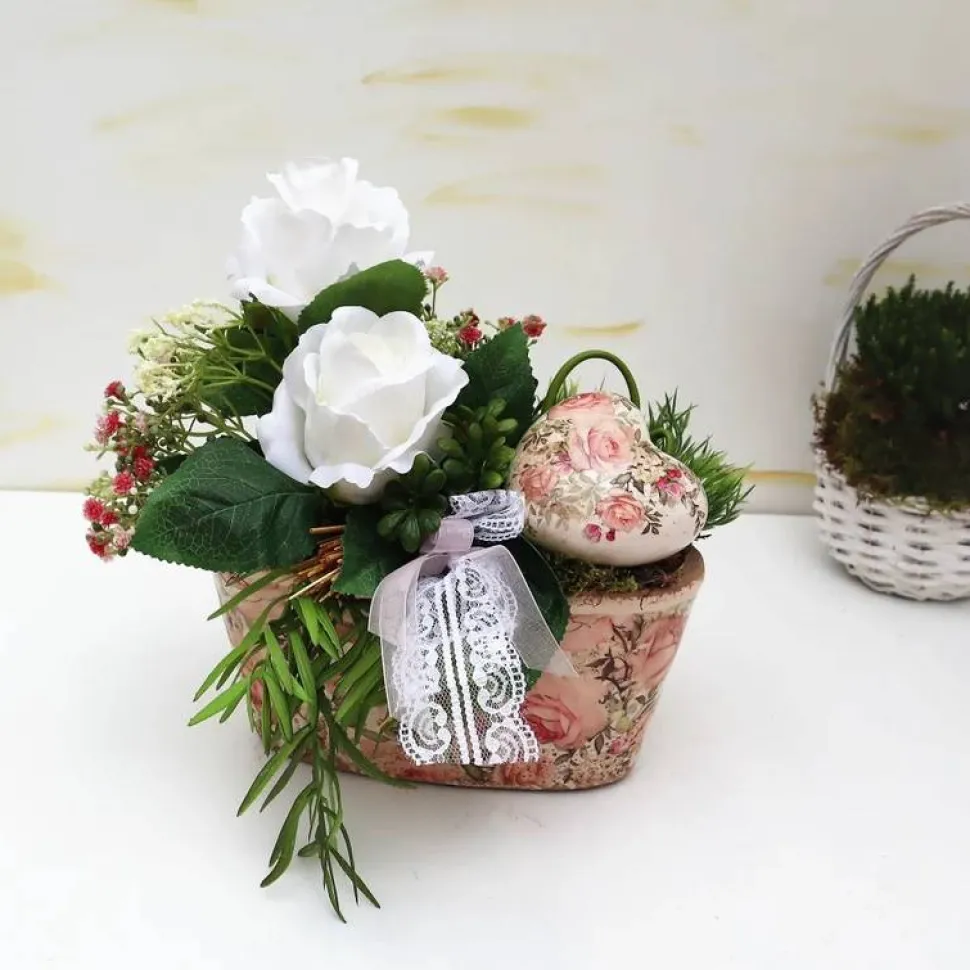 Material: Keramikschale, künstliche Blüten und Grün, Spitze, Schleifenband, Keramikherz